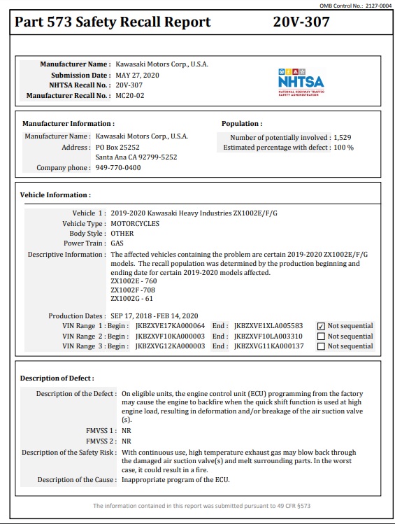 Berdasarkan notis dikemukakan Kawasaki, masalah pengaturcaraan unit kawalan enjin (ECU) boleh menyebabkan berlaku backfire ketika penunggang menggunakan fungsi klac Kawasaki Quick Shifter (KQS).