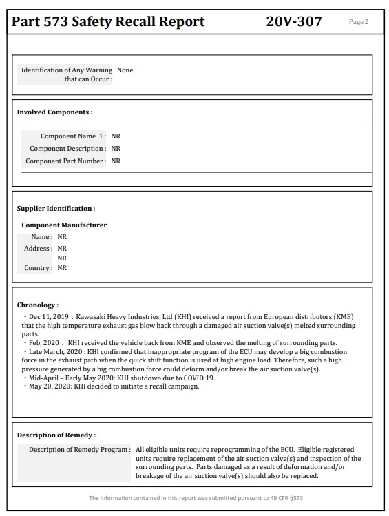- Lewat Mac 2020: KHI mengesahkan program tidak sesuai pada ECU dipercayai menyebabkan berlaku tekanan pembakaran besar dalam saluran ekzos apabila fungsi Quick Shift digunakan ketika enjin dalam beban tinggi (rpm tinggi dan pembukaan terotel lebih 50 peratus). Jadi, tekanan tinggi yang berpunca daripada tekanan pembakaran besar boleh menyebabkan kerosakan dan/atau memecahkan injap sedutan udara.