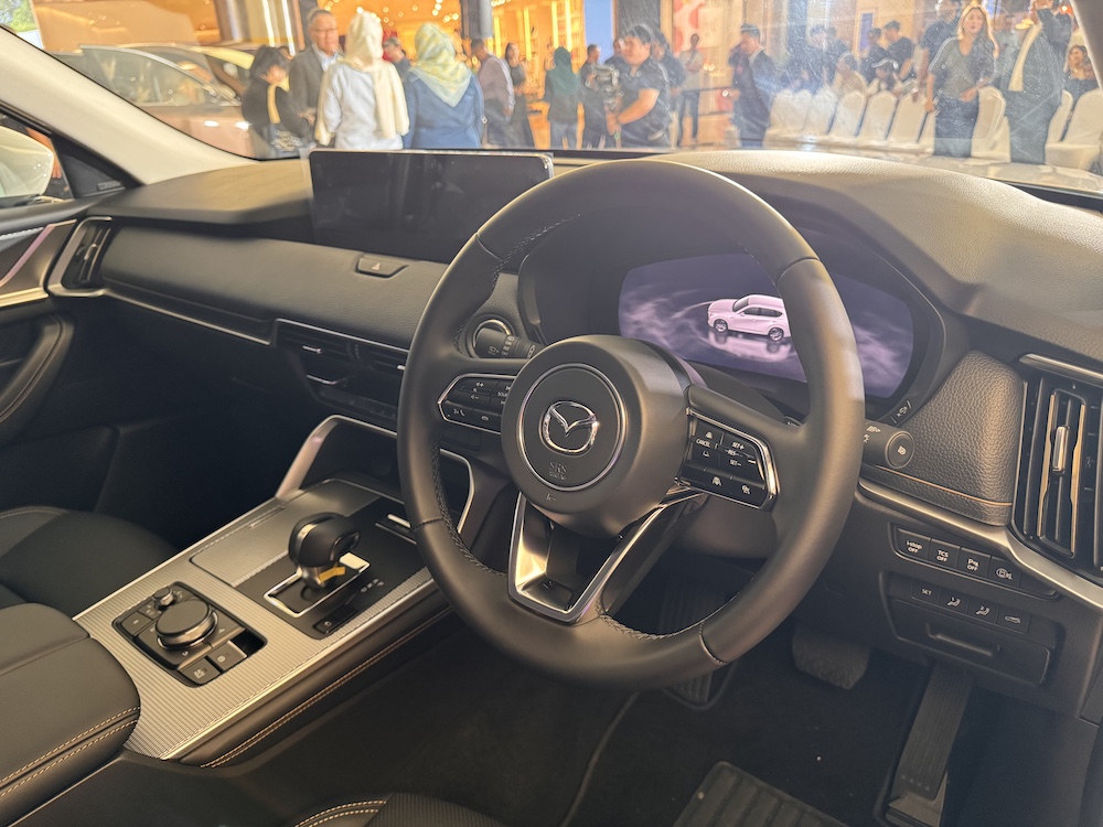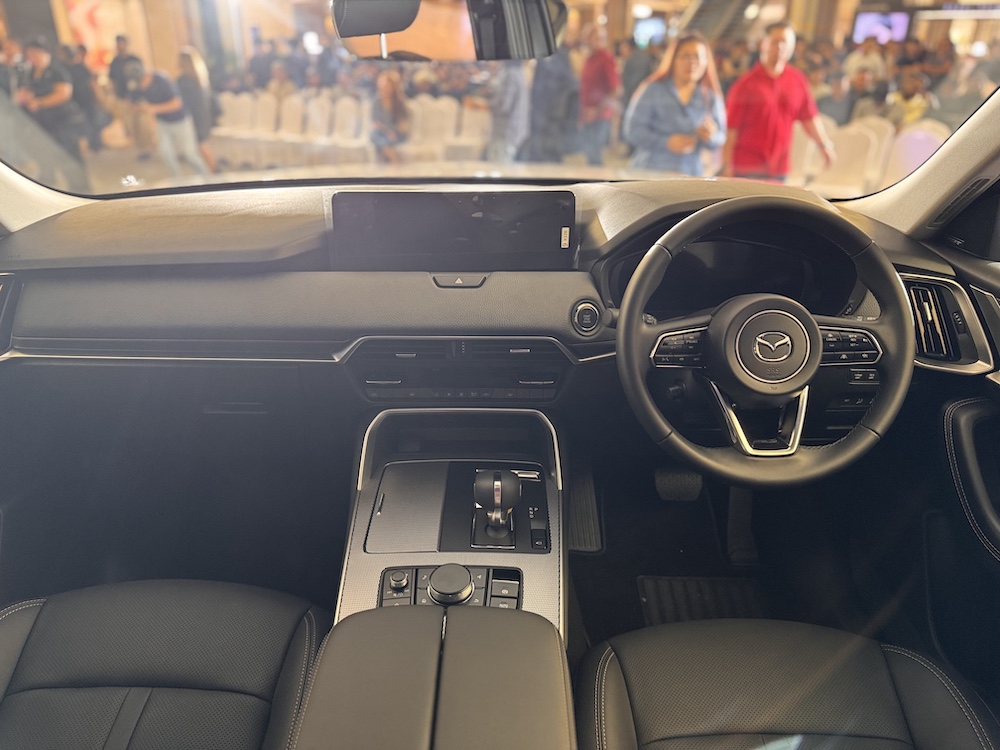 Memasuki ruang kabin, Mazda CX-60 menampilkan ruang kabin luas dengan papan pemuka lebar yang bersambung terus ke corong penyaman udara dan trim pintu. Konsol tengah pula dibina kukuh yang menyerlahkan susun atur enjin pacuan membujur, sesuatu yang jarang dalam segmen itu.