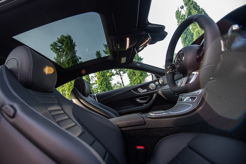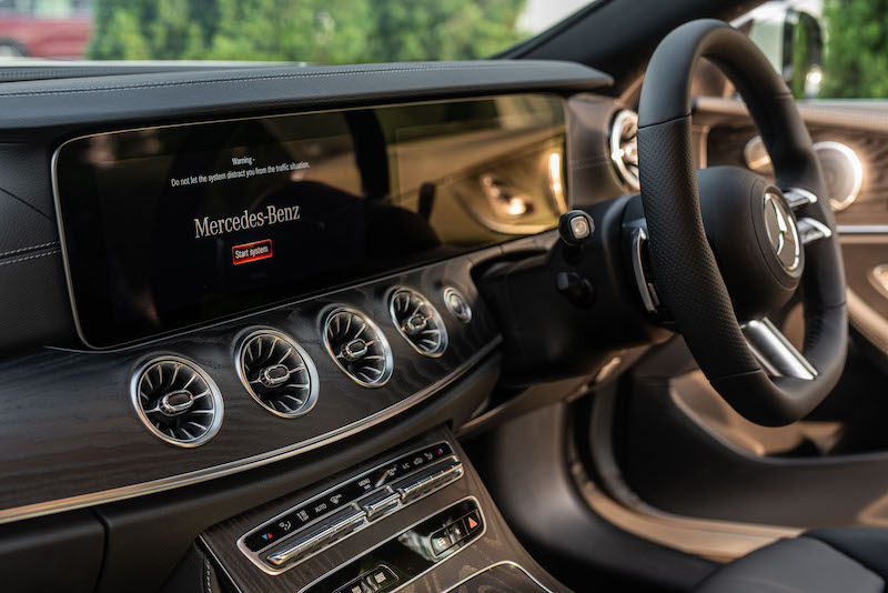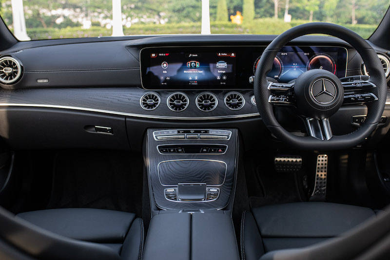 - E 300 AMG Line Coupe menggunakan sistem multimedia terkini MBUX (NTG 6). Kokpit nampak menarik dengan padanan dua skrin papan bersaiz 12.3 inci.