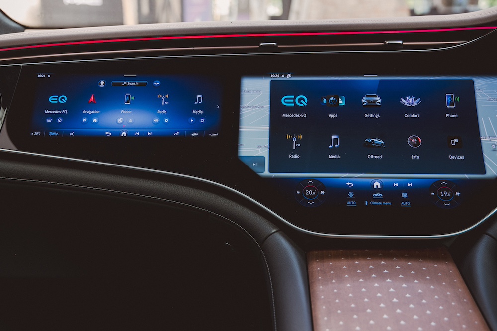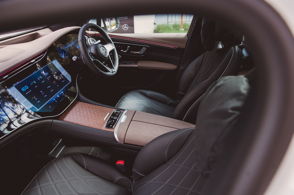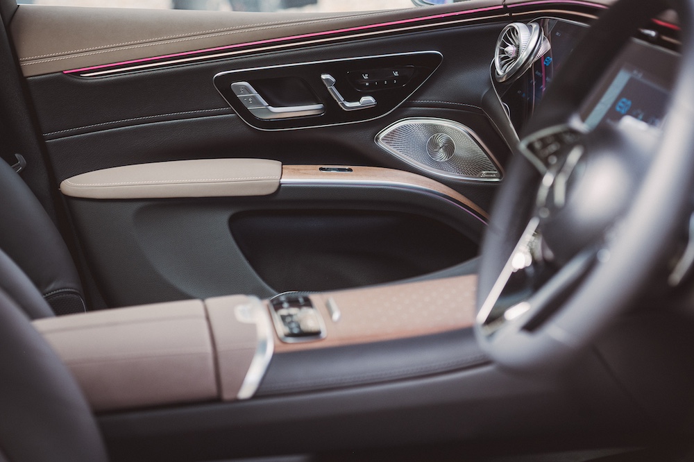 Selain ruang dalaman luas dan mewah untuk tujuh penumpang dengan keselesaan dan ciri konektiviti termaju, ruang kabin SUV EV ini diserikan dengan kemasan kayu magnolia cokelat lelubang, aksen aluminium Mercedes-Benz dan upholsteri kulit nappa hitam dam cokelat balao.