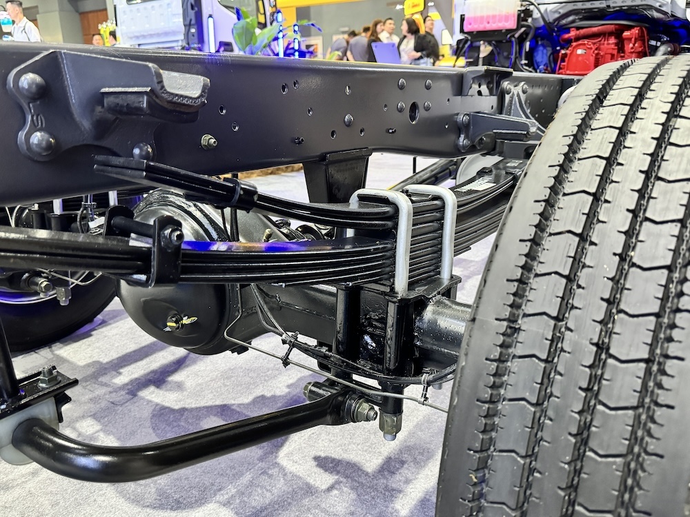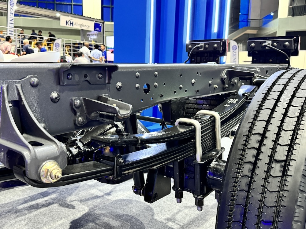 - Sistem suspensi spring daun (leaf spring) 3 dengan absorber hidraulik (depan), dan spring daun 5+2 dengan absober sama di belakang.
