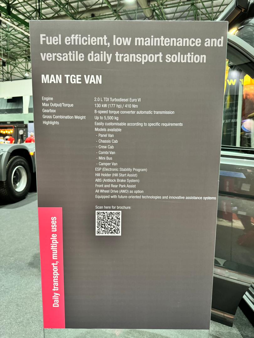 VAN komersial MAN TGE ditayangkan sempena pameran kenderaan komersial terbesar di Asean, Ekspo Kenderaan Komersial Malaysia (MCVE) 2024 yang berlangsung di Pusat Konvensyen & Pameran Antarabangssa MINES (MIECC) di Seri Kembangan, Selangor bermula 9 Mei (hari ini) hingga 11 Mei ini (Sabtu).