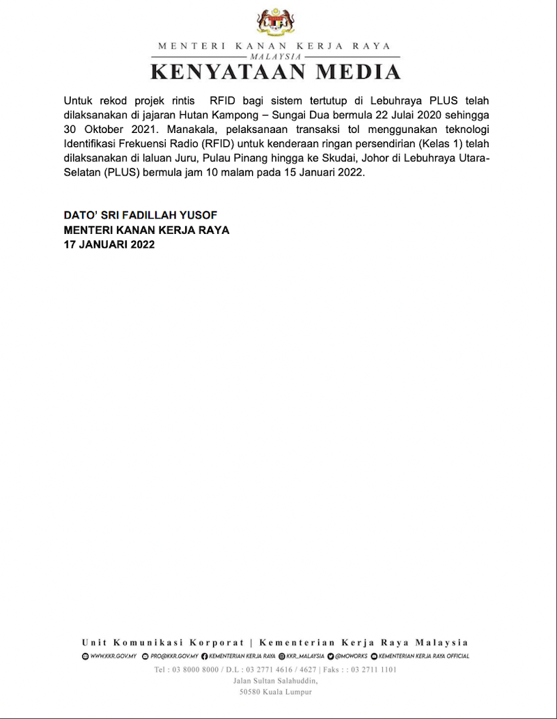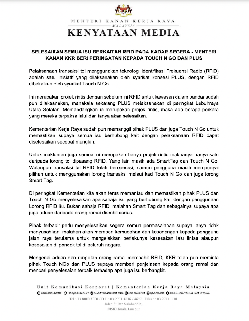 Malah Kementerian Kerja Raya (KKR) juga sudah memanggil PLUS dan TnG untuk memastikan supaya semua isu pelaksanaan RFID dapat diselesaikan secepat mungkin.