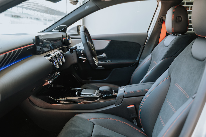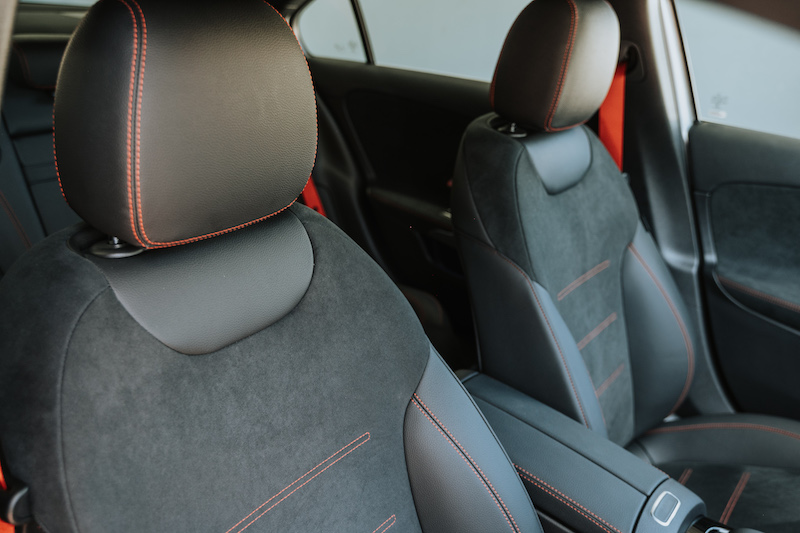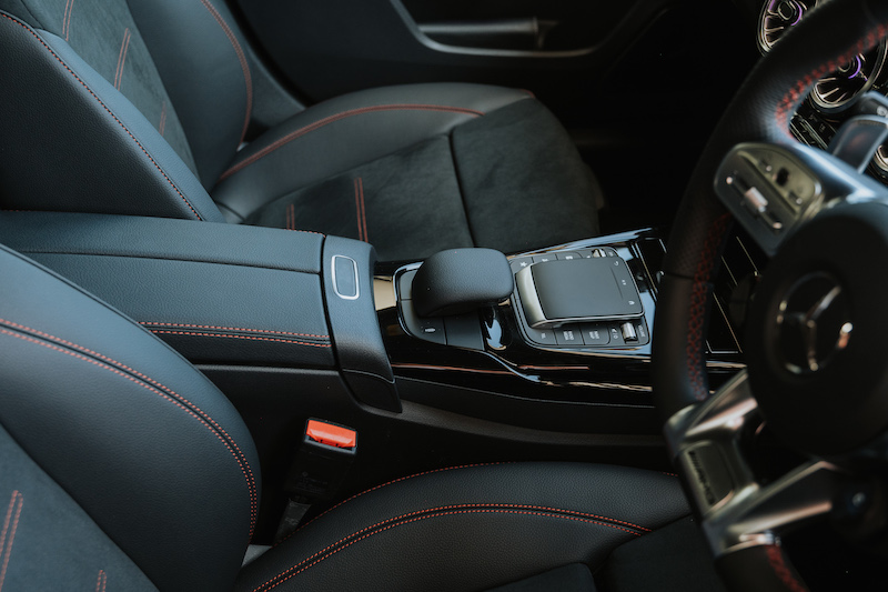 - Ada pilihan upholsteri gentian mikro Dinamica hitam atau kulit tiruan (leatherette) Artico dengan trim Aluminium AMG Design sama ada hitam atau perak.