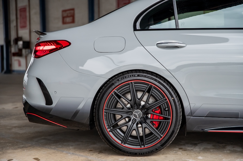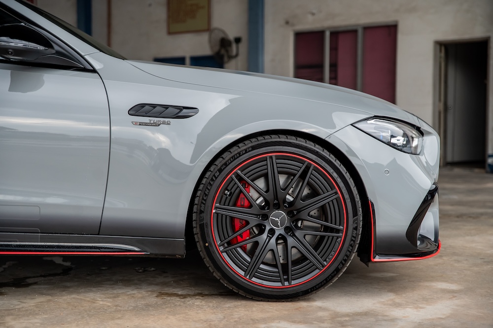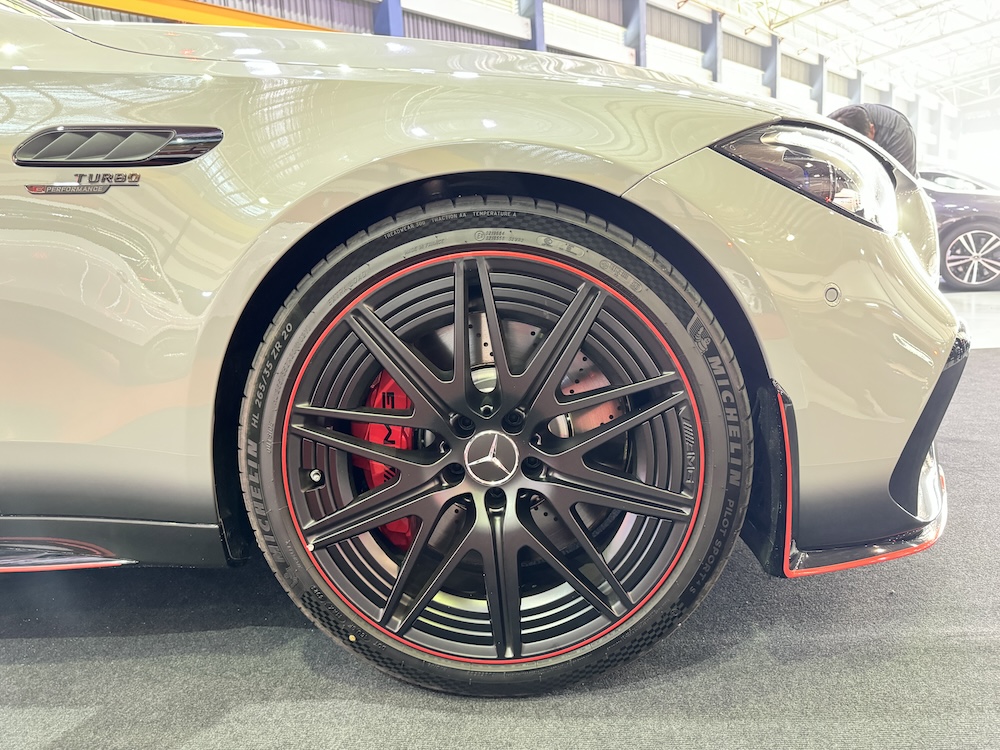 - Rim aloi AMG 20 inci 10 jejari diwarnakan hitam kusam dengan kaliper brek merah.