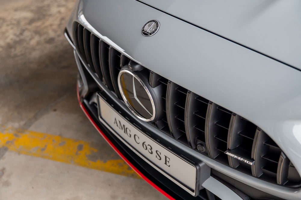 - Warna badan kelabu Manufaktur Alpine Grey Solid dengan lencana AMG besar di sisi kereta.