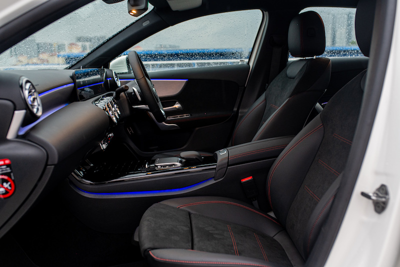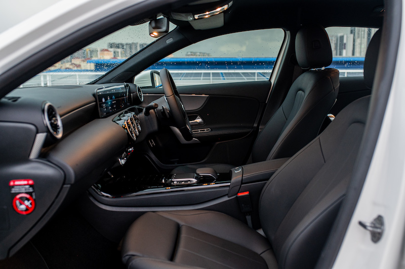 - Ruang kabin A-Class 200 membabitkan gayaan Progressive dan ada trim kemasan seakan gentian karbon dan kerusi depan jenis mewah berbanding 250 dengan gayaan AMG Line beserta roda stereng trim aluminium dan balutan material Nappa. Kerusi sport dipasang untuk varian tertinggi.