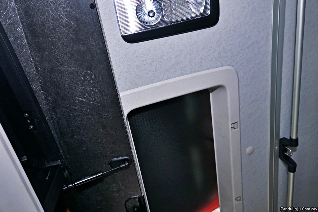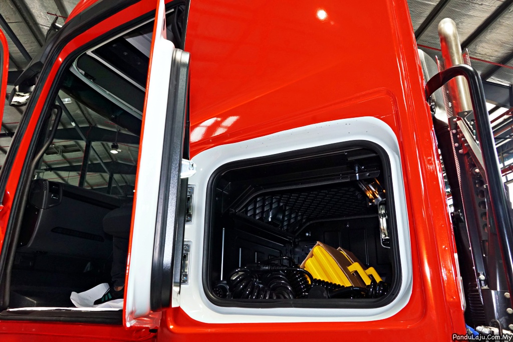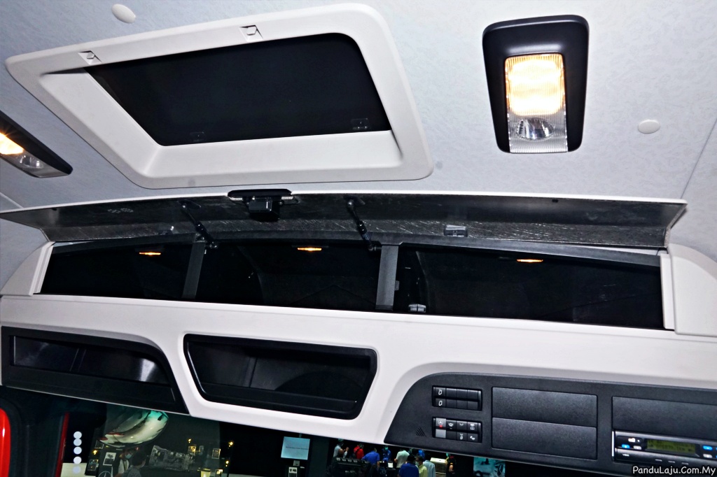 Di belakang tersedia katil untuk pemandu membaringkan badan, manakala pencahayaan dalam kabin dikawal menerusi panel suis di sisi tilam. Ruang simpanan yang banyak membolehkan simpanan barang untuk trip perjalanan jauh.