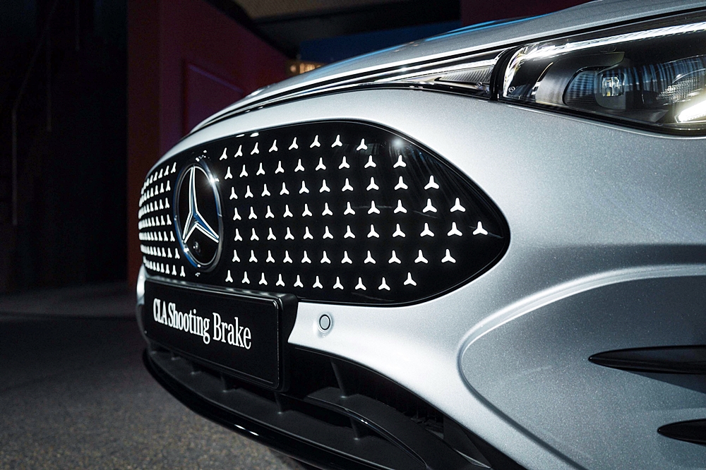 CLA Shooting Brake 2026 mengekalkan rekaan hadapan CLA sehingga ke tiang B, termasuk elemen “hidung jerung” dan panel depan bercahaya dengan 142 bintang LED krom.