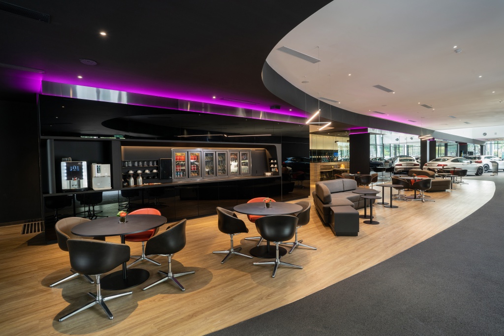 Ruang sambut tetamu berfungsi sebagai pusat pengalaman pertama kepada pelanggan. Proses dan seni bina direka optimum untuk ketenangan fikiran. Pengalaman pembelian jenama mewah ini bermula di ruang jualan dan selepas jualan sebaik saja masuk ke Autohaus.