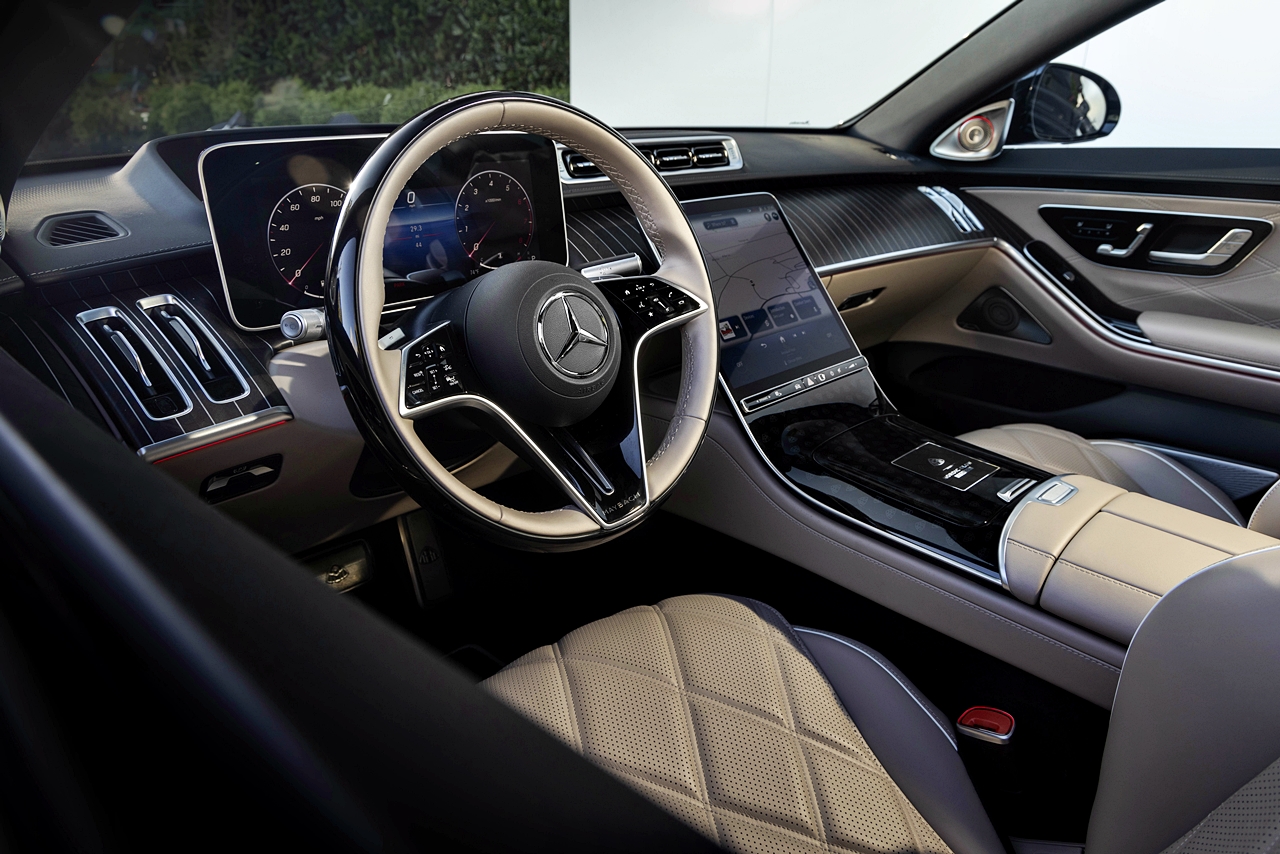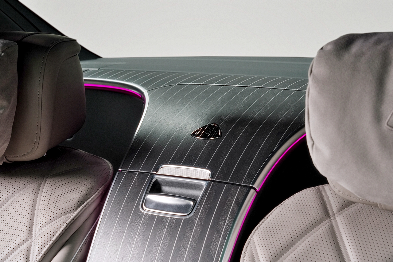 - Trim Manufaktur Natural Grain Herringbone Pattern Dark Walnut Wood daripada Maybach Night Series Design Package dan tema warna cerah menaikkan keanggunan dalaman kereta.