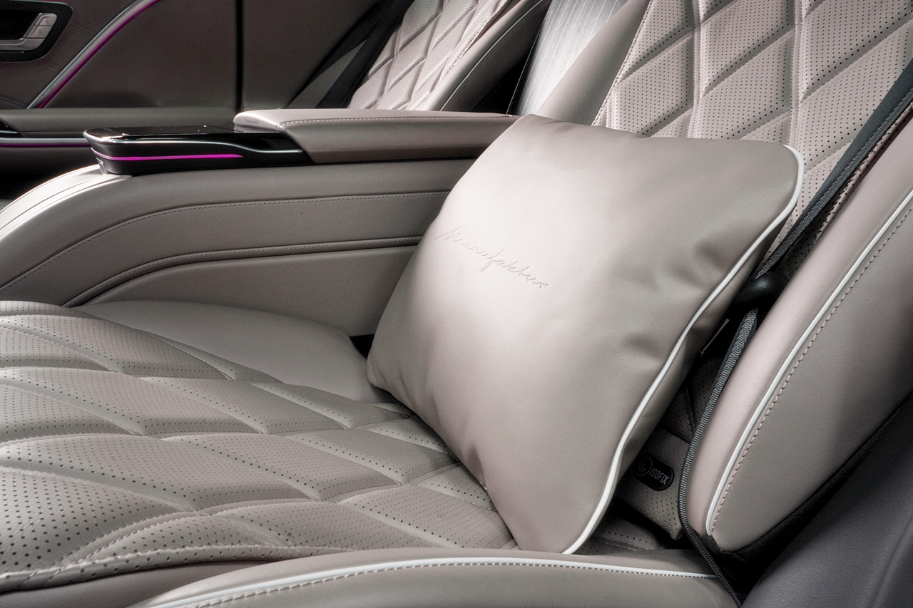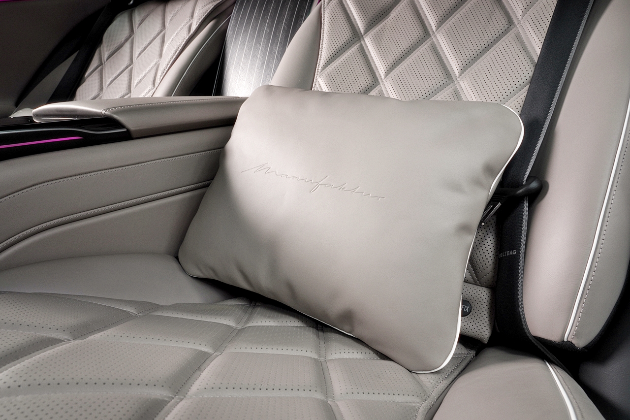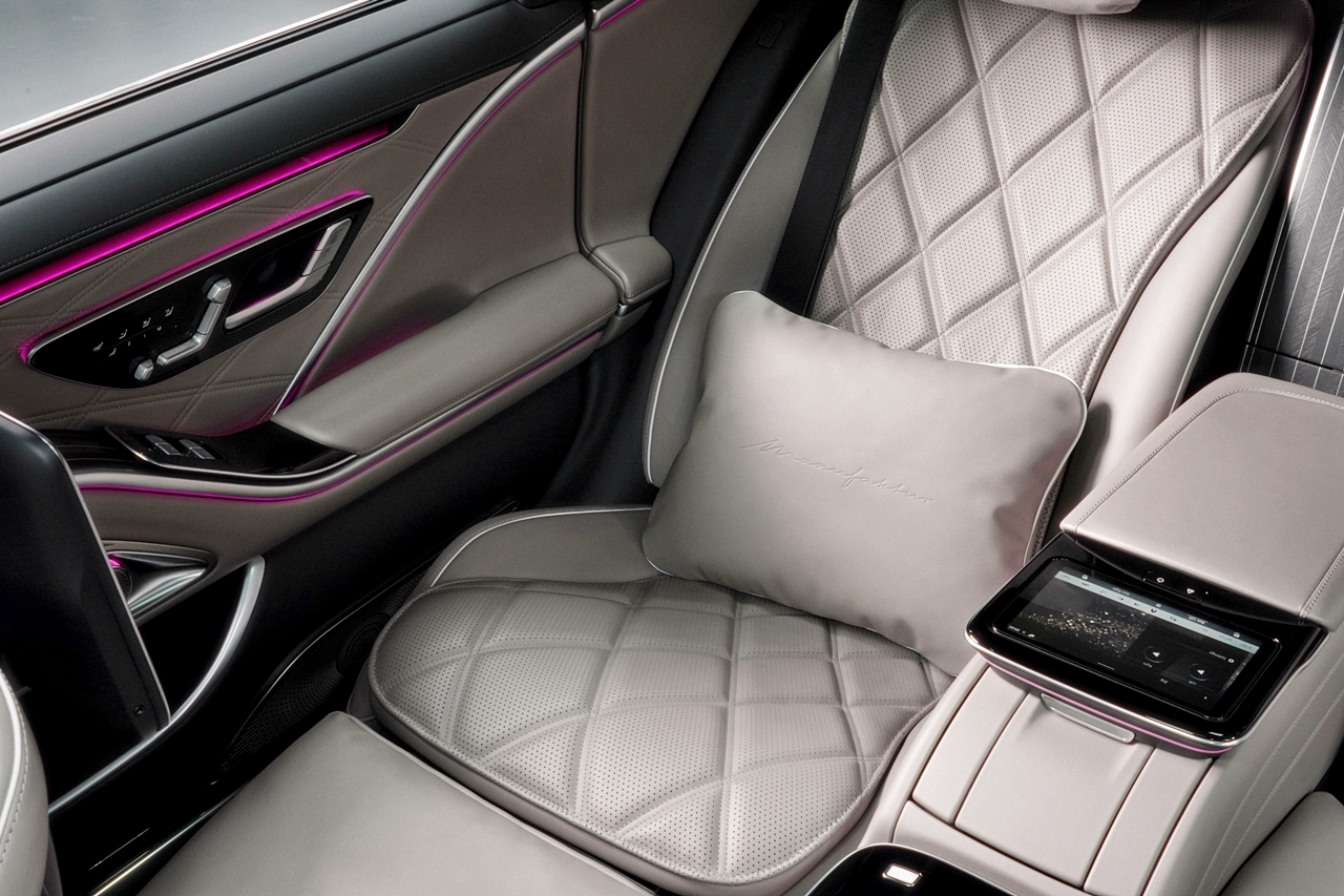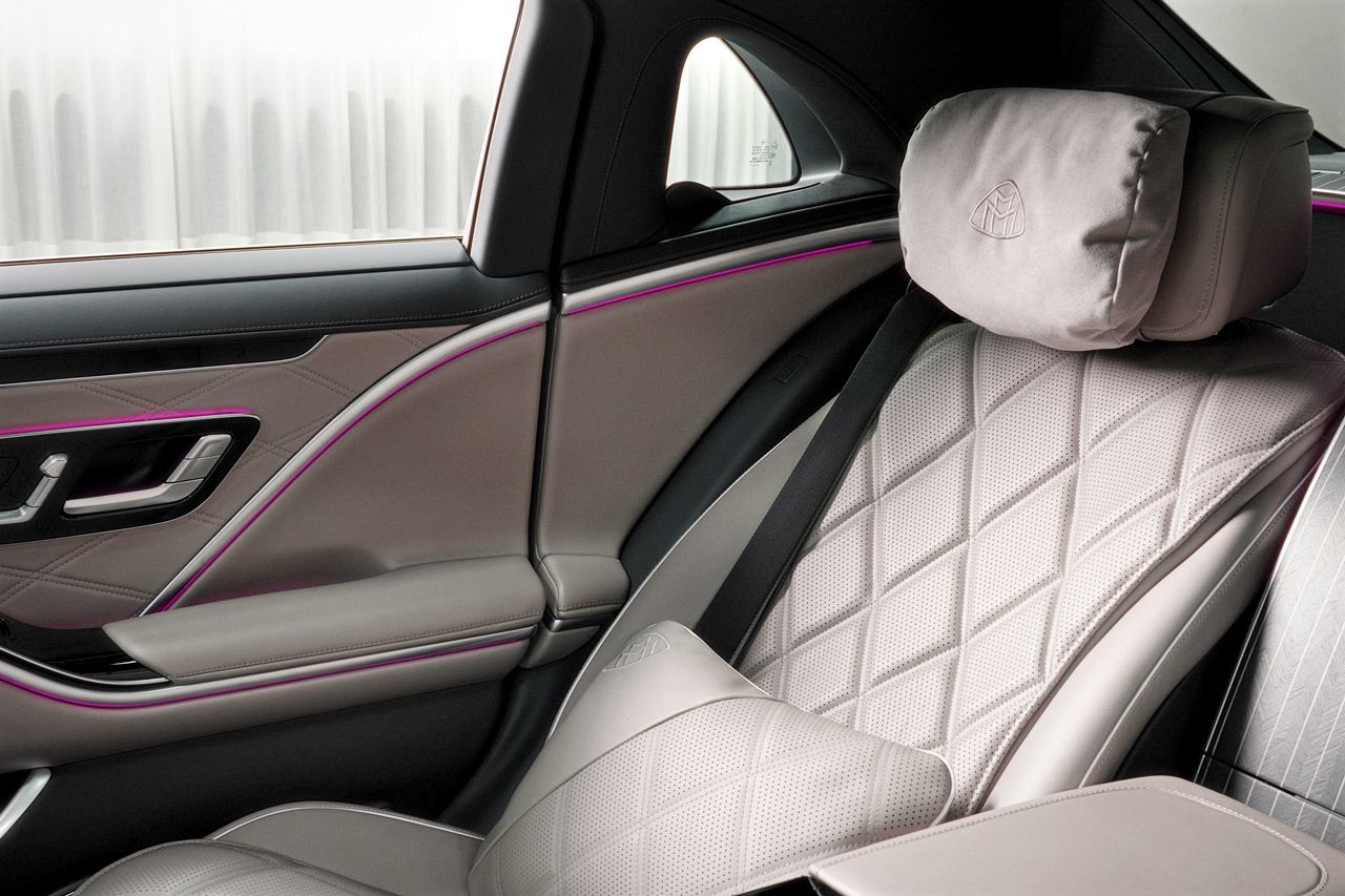 - Karpet kaki bebenang tinggi dengan logo Mercedes-Maybach dan kun alur kulit Nappa kelabu menyerlahkan lagi kehalusan perkakasan kereta ini.