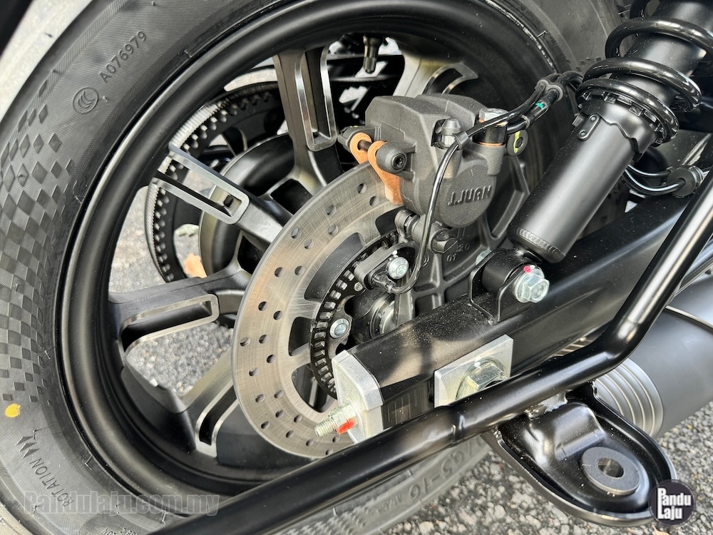 - Brek cakera tunggal 320mm dengan kaliper dwi-piston J Juan (depan), dan brek cakera tunggal 255mm dengan kaliper piston tunggal J Juan (belakang).