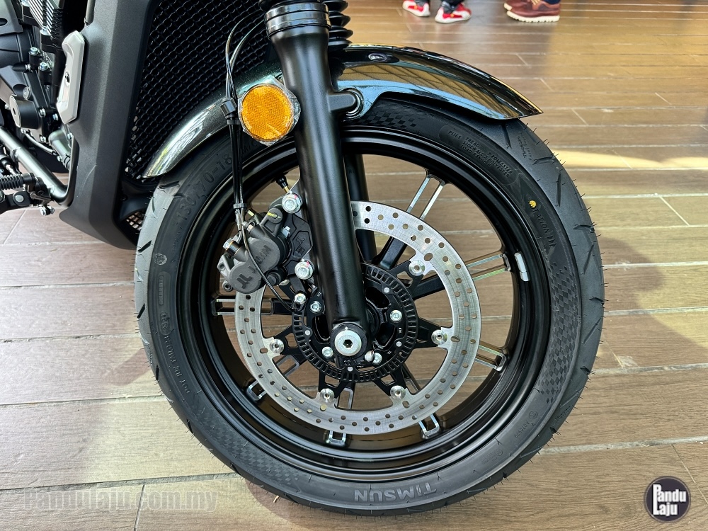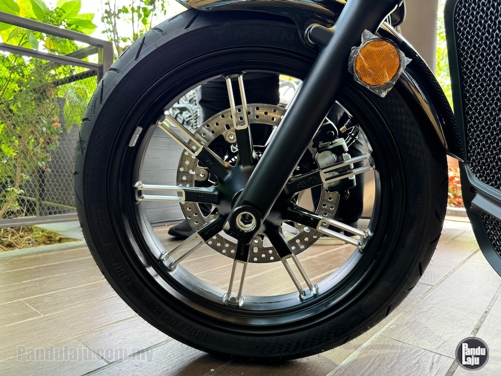 - Rim aloi 18 inci dengan tayar Timsum 130/70 (depan), dan rim 16 inci dengan tayar Timsum 180/65 (belakang).