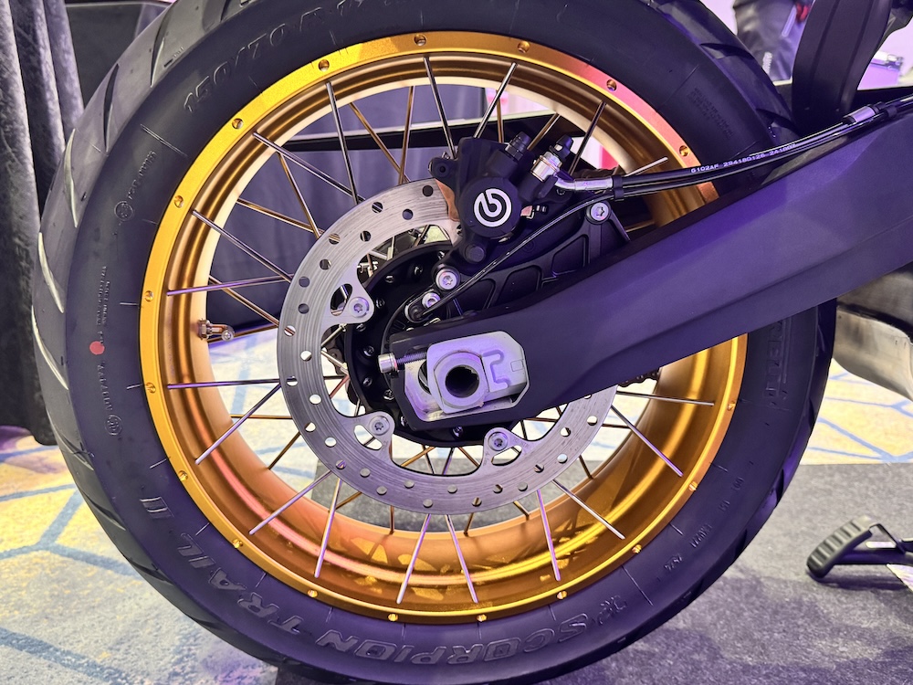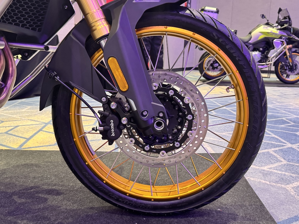 - Rim jejari 21 inci dengan tayar tiubles saiz 90/90 di depan, dan rim 17 inci dengan tayar tiubles 150/70 (belakang).
