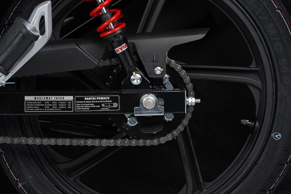 - Enjin karburetor 4-lejang 2-injap silinder tunggal 109cc penyejukan udara berkuasa 6.7hp @ 7,500rpm, dan tork 7.6Nm @ 4,500rpm.