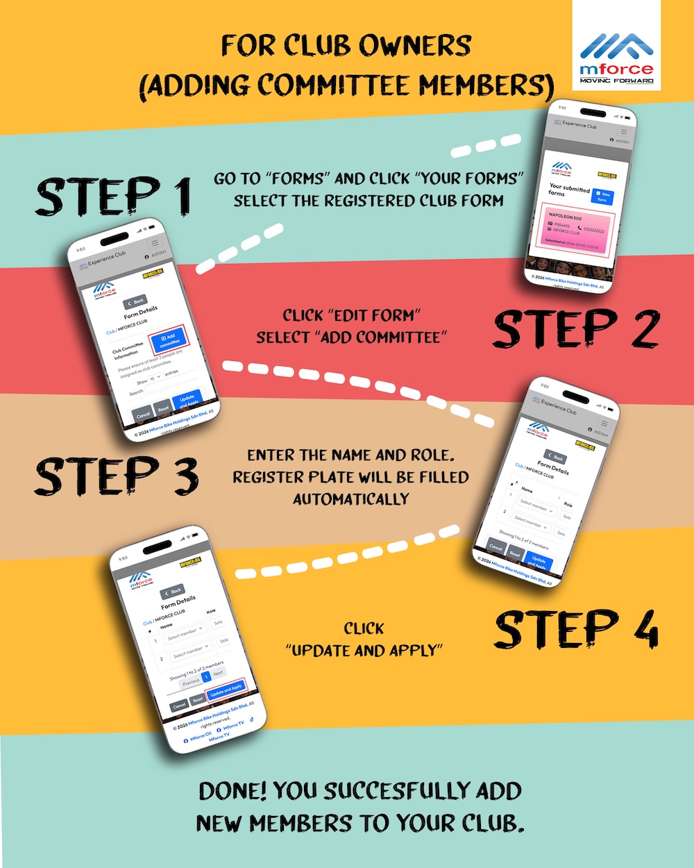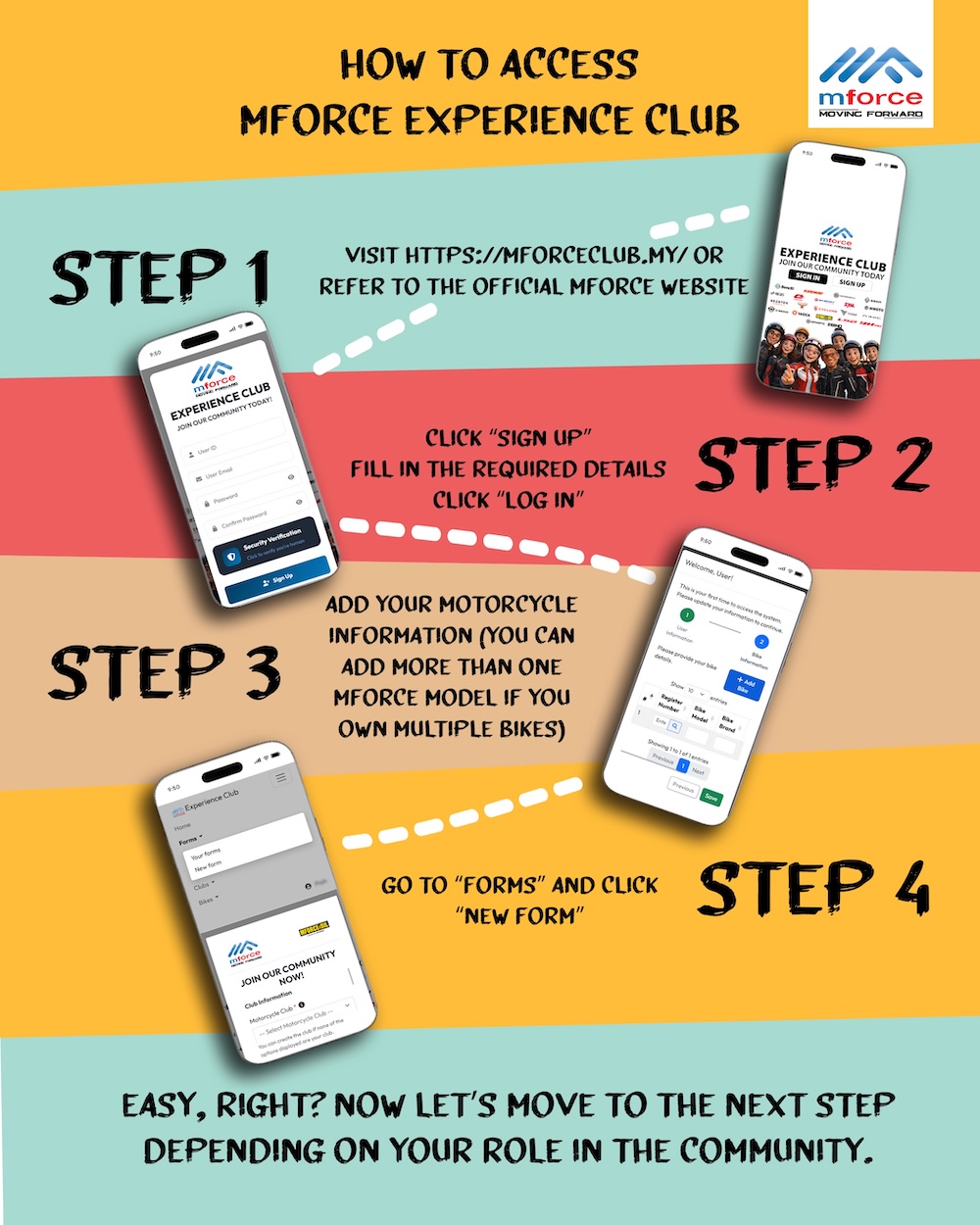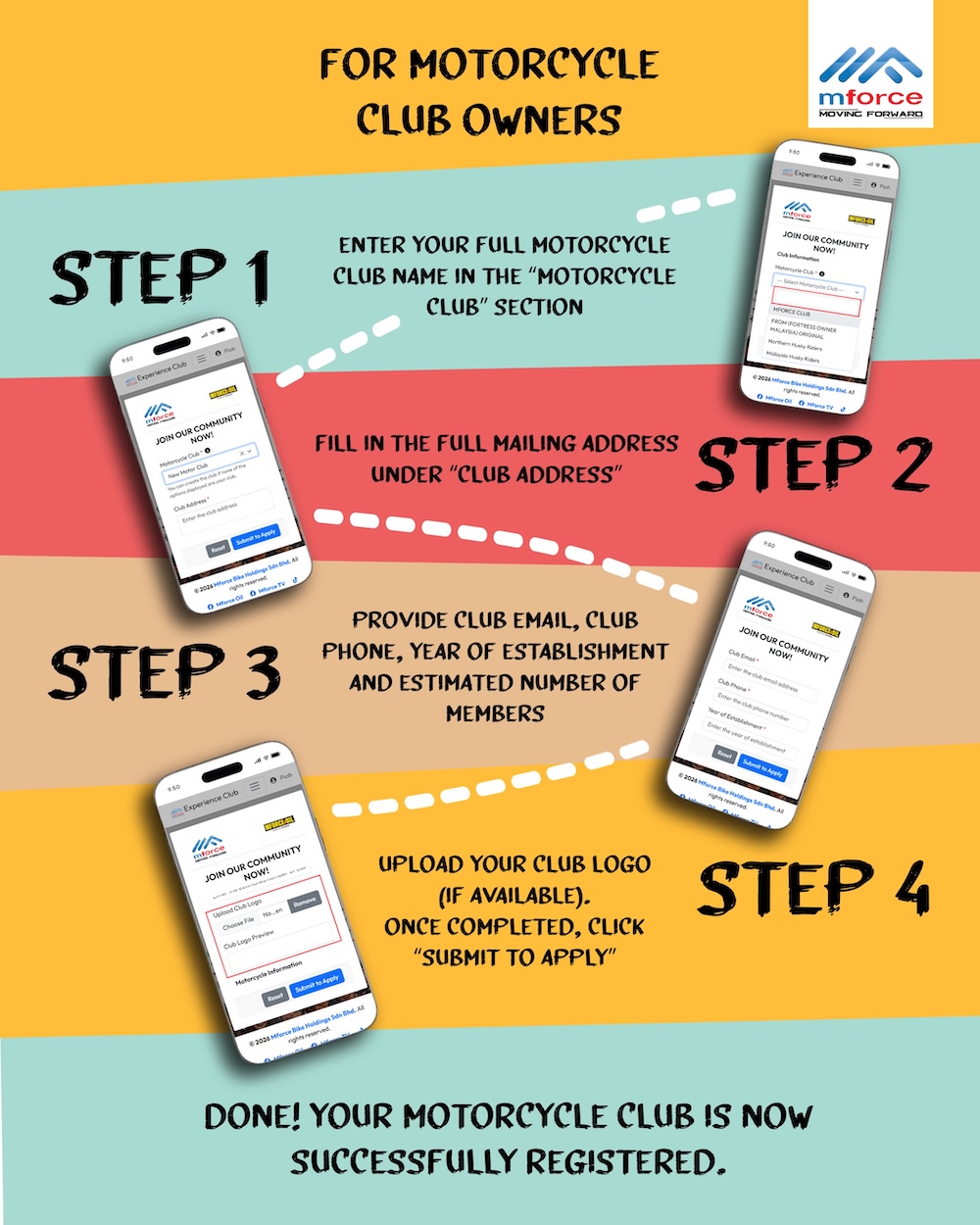 Melalui platform itu, pemilik motosikal bawah jenama Mforce berpeluang menjadi sebahagian komuniti tersusun yang diiktiraf syarikat secara rasmi. Ini membuka ruang penglibatan dalam pelbagai aktiviti dan program yang dianjurkan khas untuk ahli.