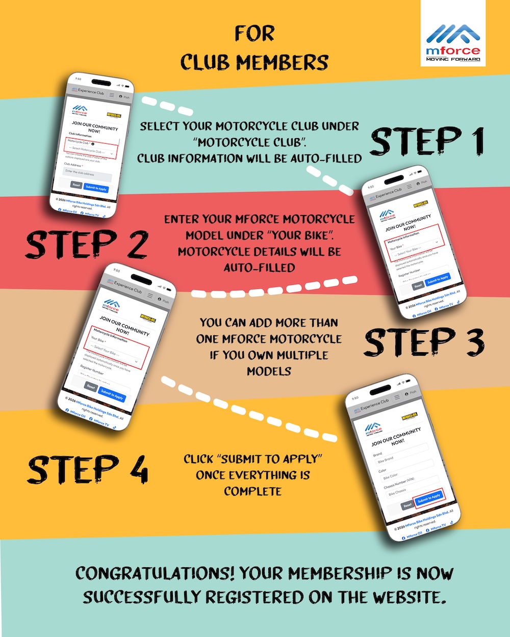 Ahli berada di bawah naungan komuniti rasmi yang disokong sepenuhnya Mforce Bike Holdings.