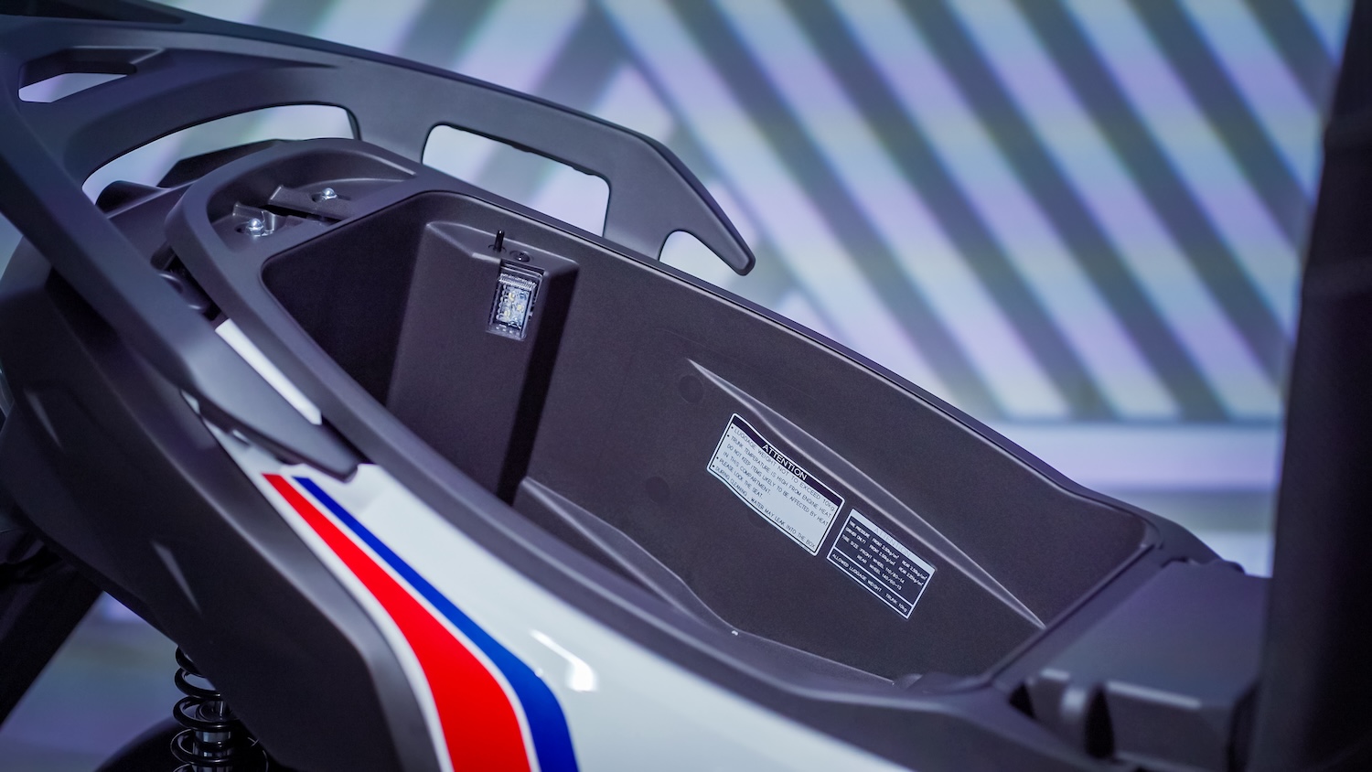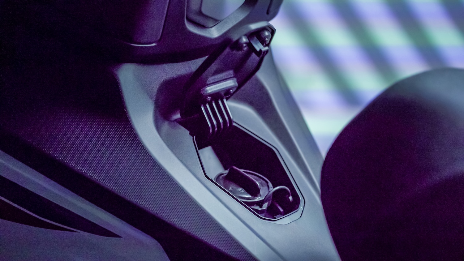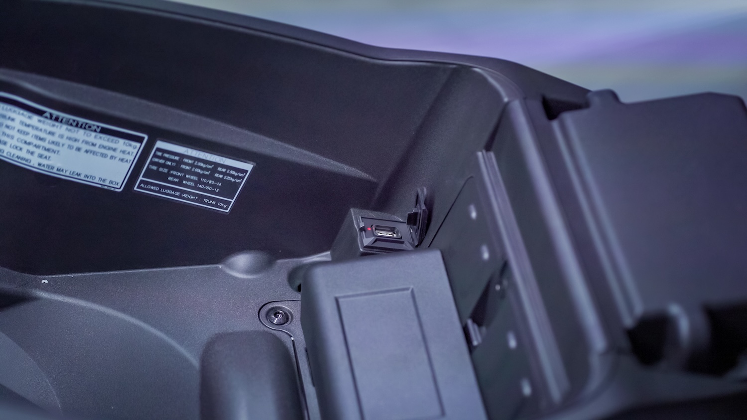 - Dua port USB (dalam ruang storan depan dan bawah pelana).