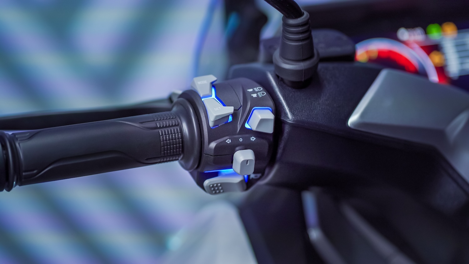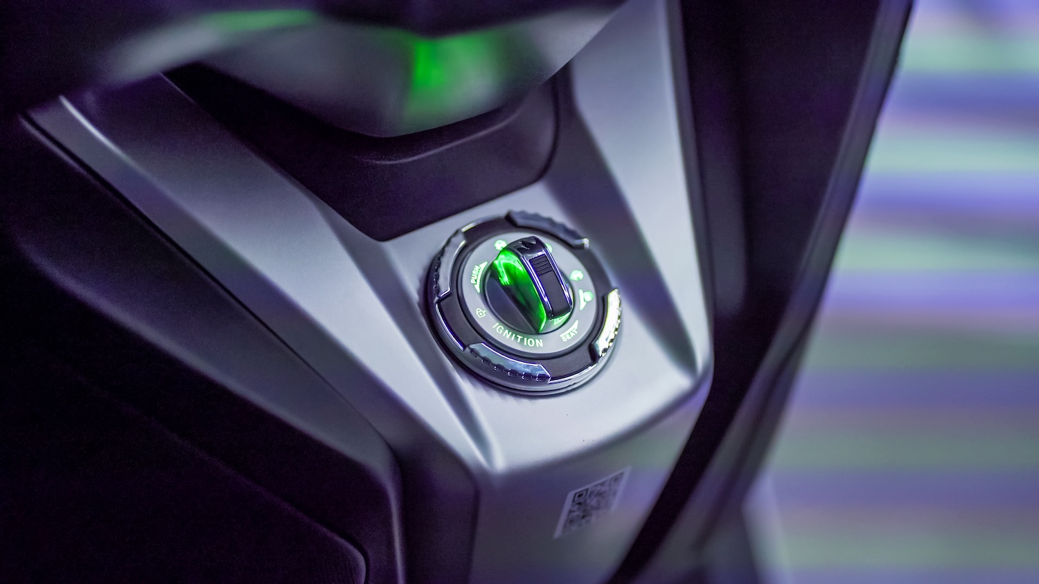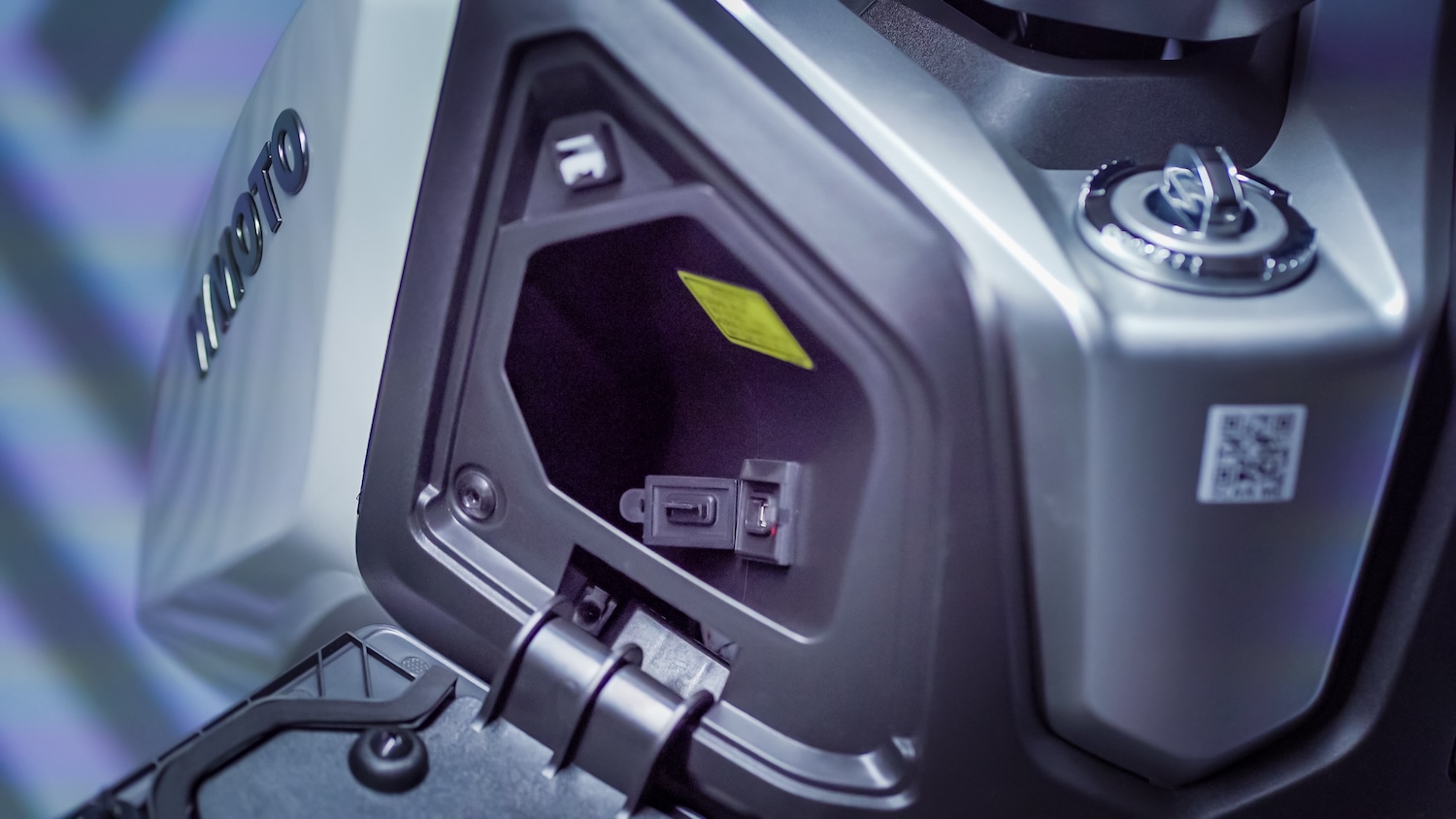 - Dua port USB (dalam ruang storan depan dan bawah pelana).