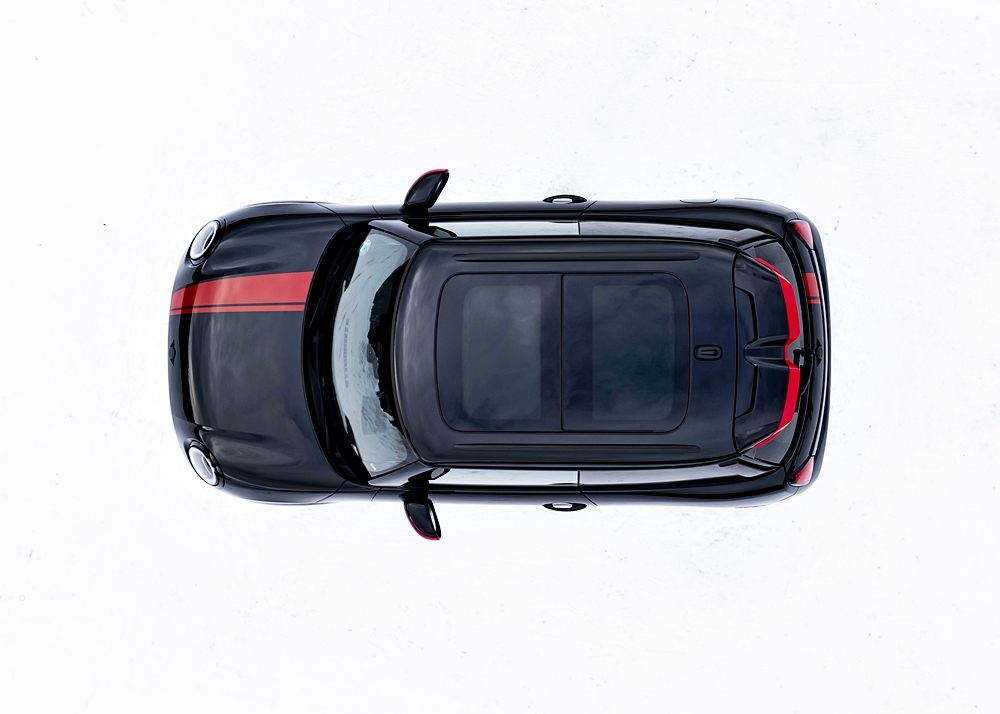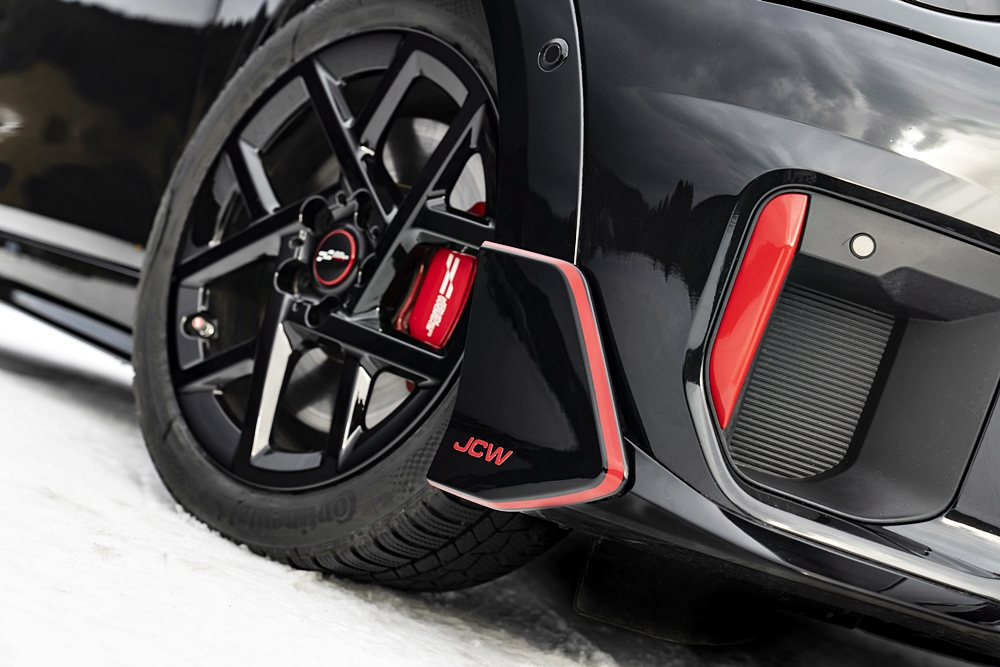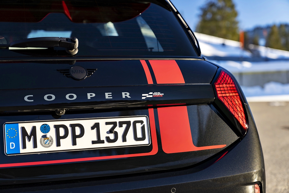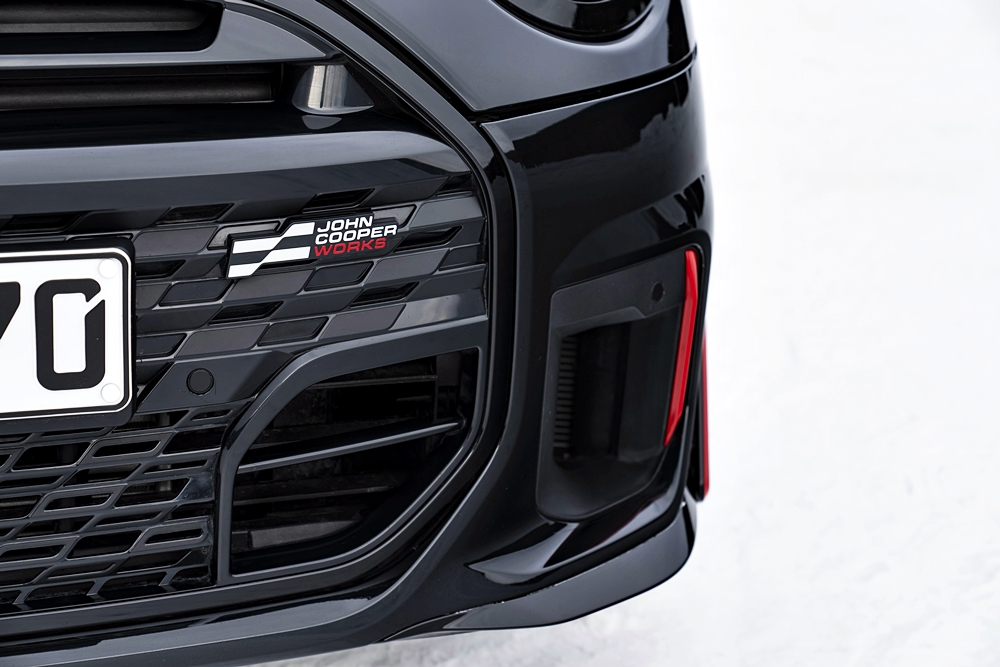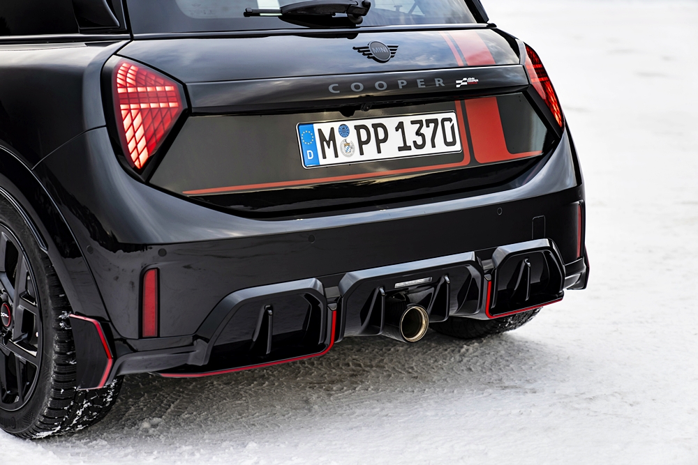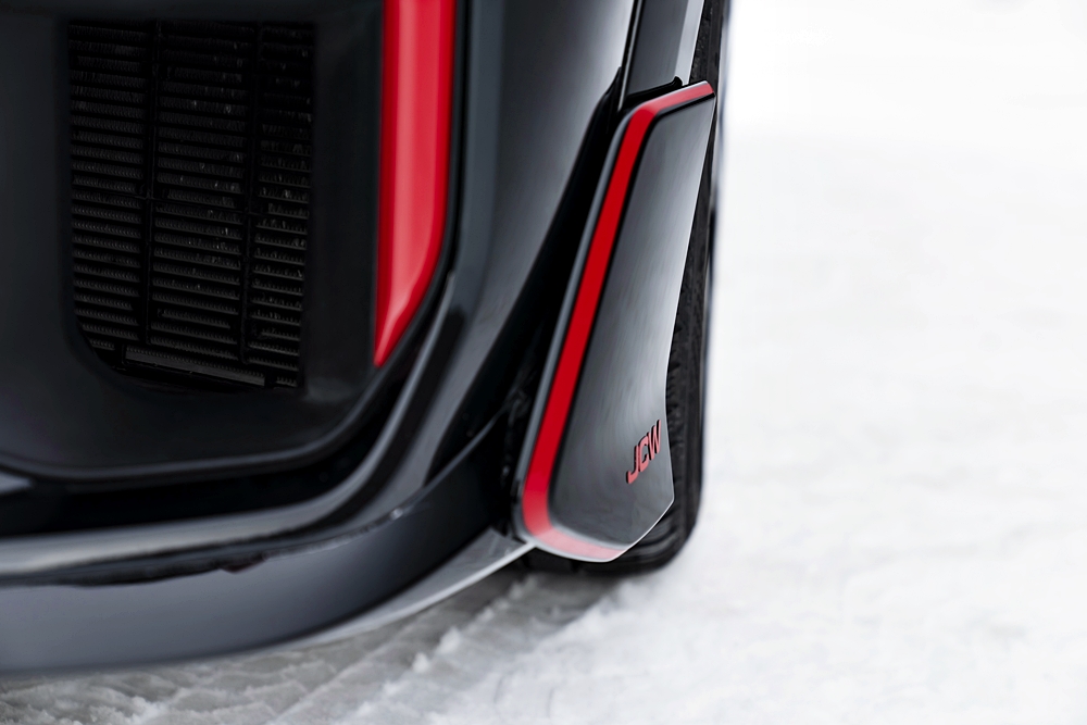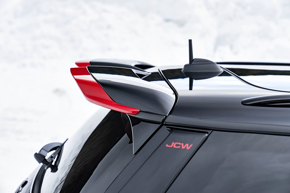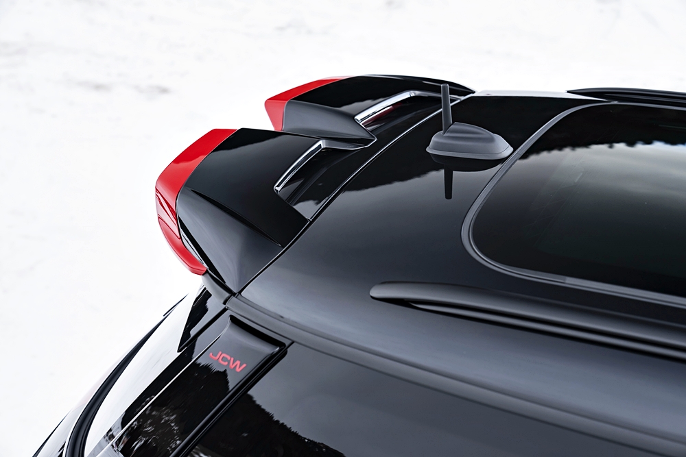 - Bentuk dan rekabentuk sirip dibangunkan khas untuk MINI John Cooper Works dengan warna hitam kilat dan merah cili bersama spoiler dan difuser JCW membentuk pakej sporty yang serius.