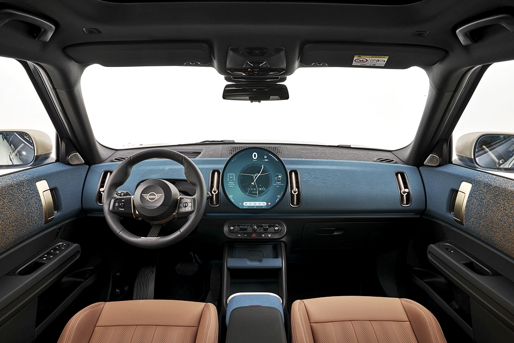 Ruang kabin MINI Countryman (2024) tampil dalam gaya minimalis model klasik MINI. Paling menyerlah ialah unit infotainmen bulat besar pada papan pemuka dan suis jenis togol di bawah.
