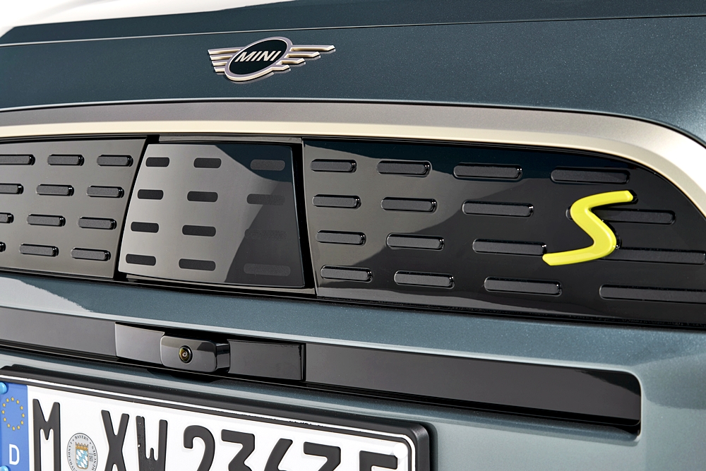 Bahagian depan menyerlah dengan gril berbentuk oktagon dan sensor radar kecil yang dipasang sekata sebagai ciri teknologi pemanduan automasi Tahap 2 dan pertama bagi model MINI.