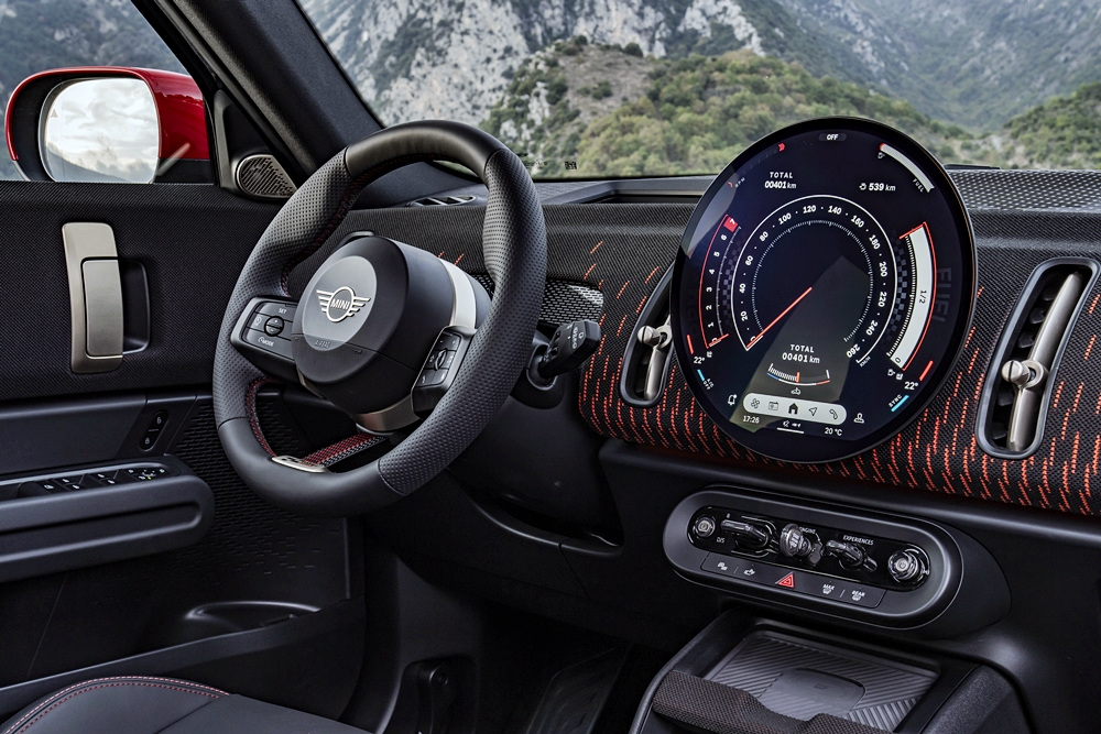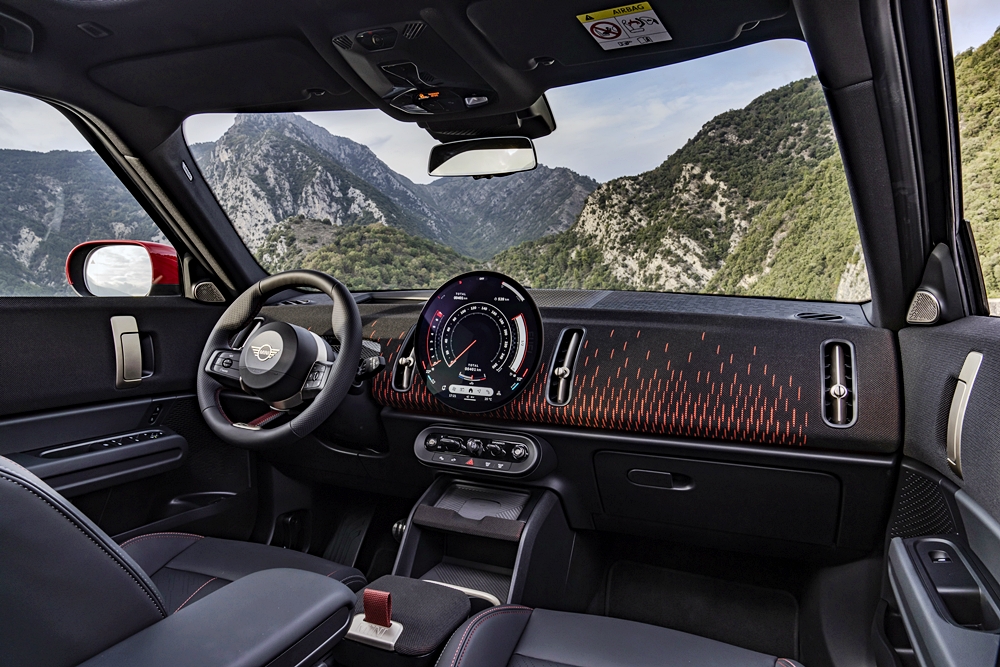 Paling menyerlah ialah skrin bulat di tengah papan pemuka dengan paduan gabungan aksen merah dan hitam. Gabungan warna itu diteruskan pada kerusi sport JCW. Kerusi belakang boleh laras hingga 13sm dan jika dilipat ke bawah, ruang 460 liter dapat bertambah hingga 1,450 liter.