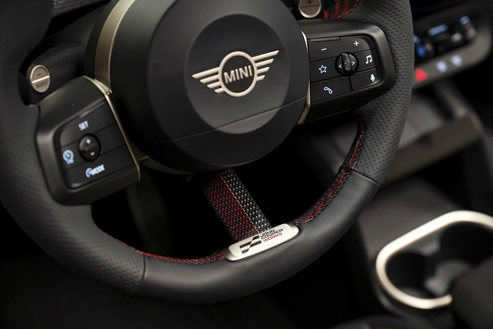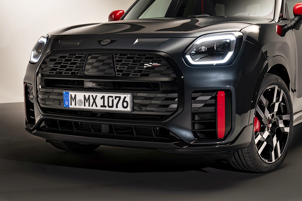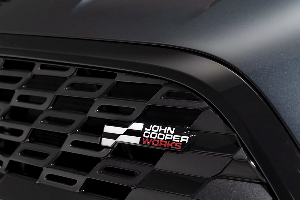 Pada bahagian depan, objek aerodinamik dengan reflektor menegak menonjolkan lebar kereta. Bahagian depan juga tampil menarik dengan gril baharu corak oktagon hitam kilat dan logo tiga warna JCW.