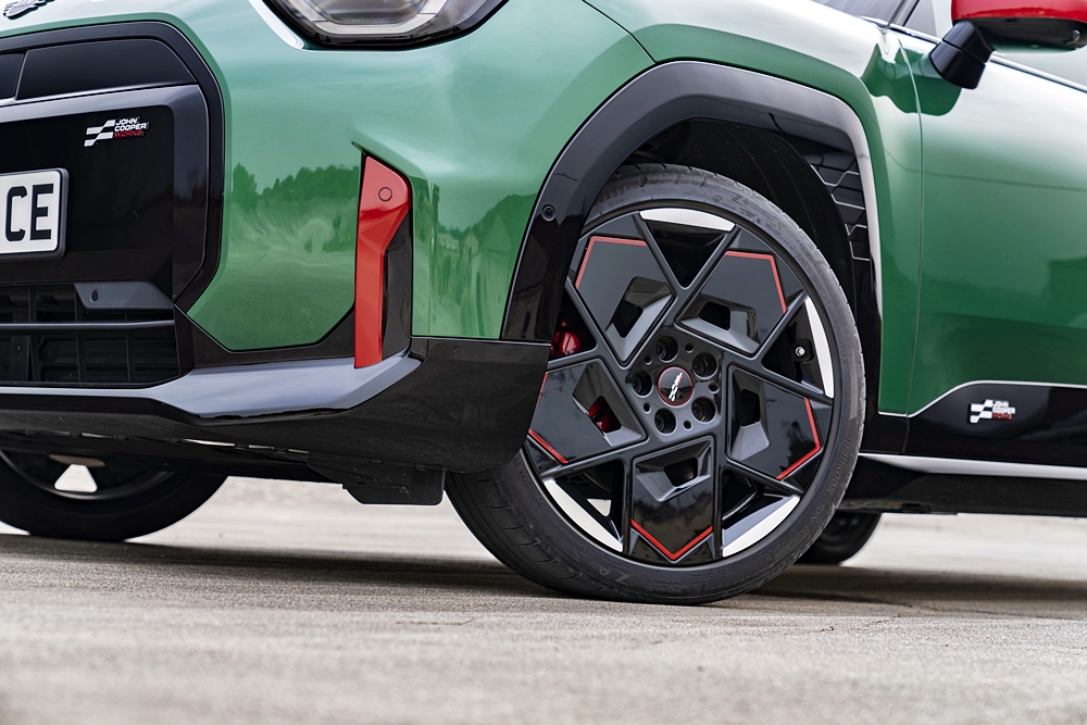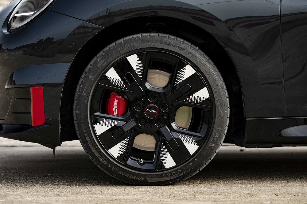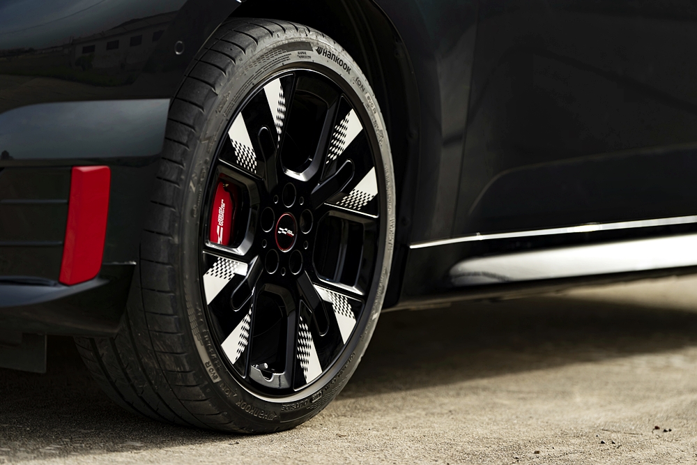 Tayar berprestasi dan cengkaman tinggi siap dipasang dari kilang. Kaliper brek warna Chili Red dan logo JCW warna putih menaikkan lagi aura kereta.