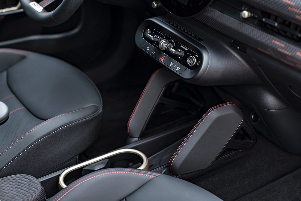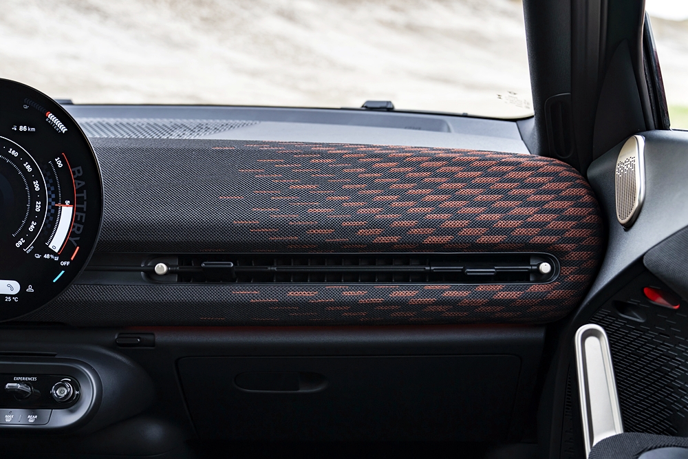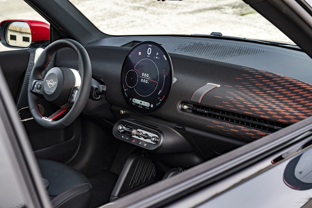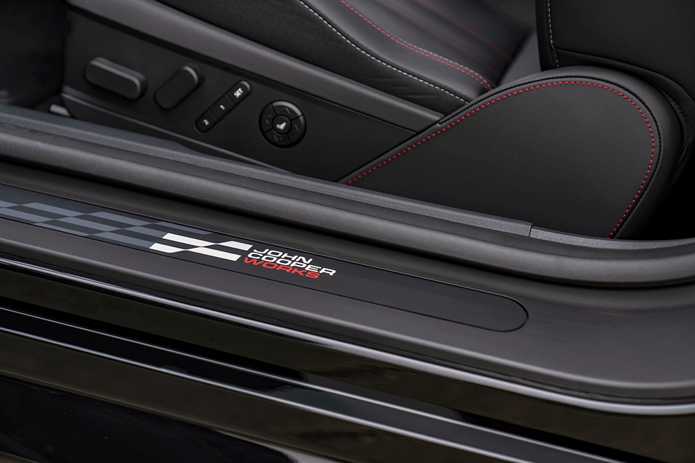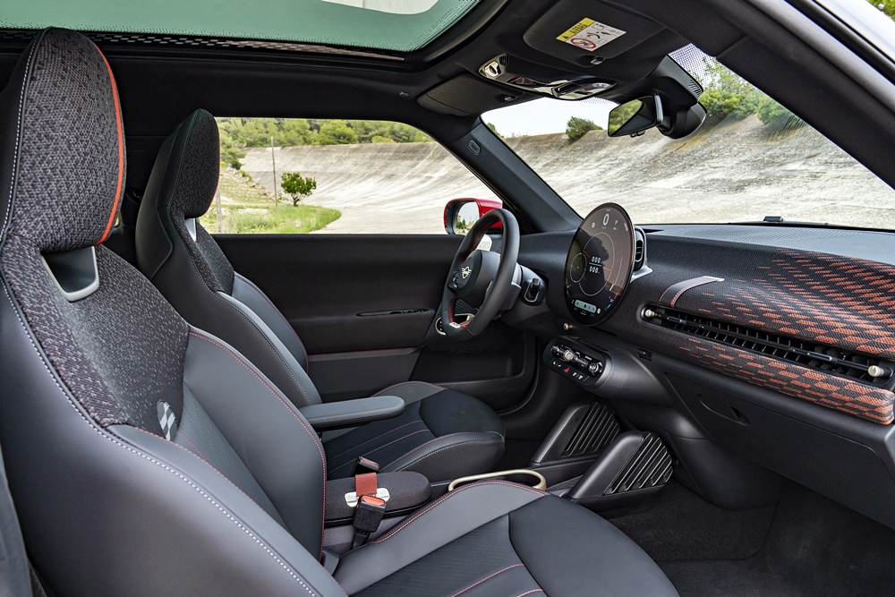Bahagian dalam membawa identiti JCW melalui permainan warna hitam dan merah. Kerusi depan dibalut kulit tiruan warna hitam dan fabrik rajutan berwarna-warni di bahu dan jahitan aksen merah.