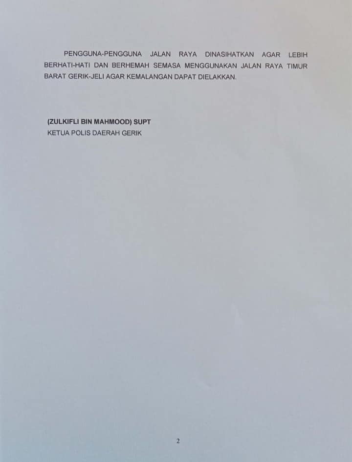Orang ramai yang ada maklumat mengenai kes berkenaan diminta menghubungi pegawai penyiasat kes, Inspektor Mohd Zaidi Mat Yasin di talian 013-448 7374 untuk membantu siasatan. Kes disiasat di bawah Seksyen 41(1) Akta Pengangkitan Jalan 1987.