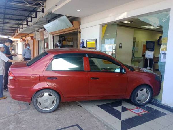 AKIBAT tidak mematikan enjin, sebuah kereta jenis Proton Saga FLX milik seorang wanita bergerak sendiri dan merempuh pintu kaca sebuah bank hingga berderai dalam insiden yang berlaku pagi tadi di Sipitang, Sabah.