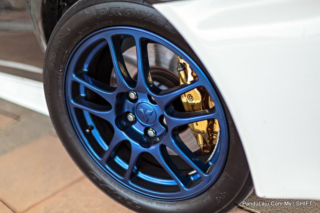 Sistem suspensi pula dinaiktaraf dengan menempatkan suspensi boleh laras sepenuhnya dari jenama Titan. Untuk tampak lebih garang, empunya jentera memilih set rim OEM Lancer Evolution 9 yang dibaluti dengan tayar berprestasi dari jenama Toyo R888 235/45/17.