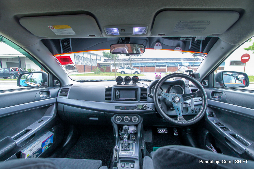 Di bahagian dalaman, komponen asal Evo X kekal seperti sedia ada, cuma stereng asal ditukarkan kepada Nardi Torino. Papan pemuka dihiasi meter-meter buatan Defi, Blitz ID3 Boost Controller dan Apexi Turbo Timer.