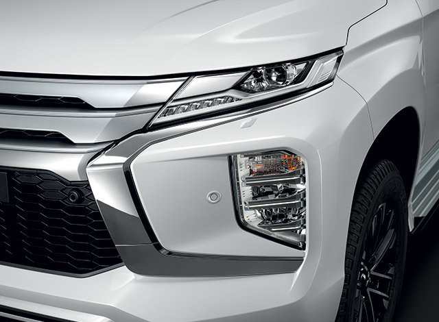 - Tiga panel krom melintang sepanjang gril menjadi rekabentuk signatur baharu Mitsubishi, dipanggil Dynamic Shield. Wajah baharu ini lebih mirip kepada Triton.