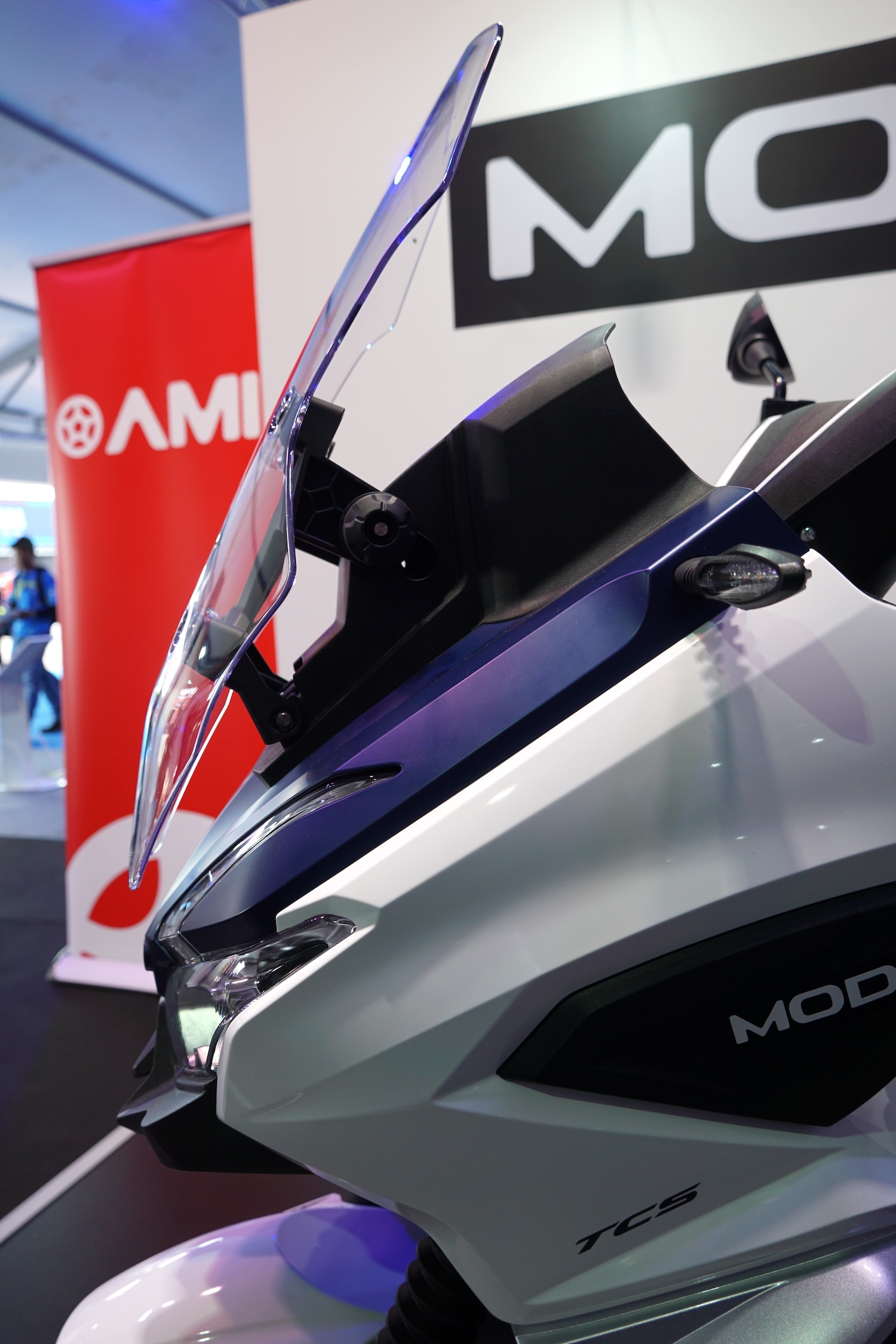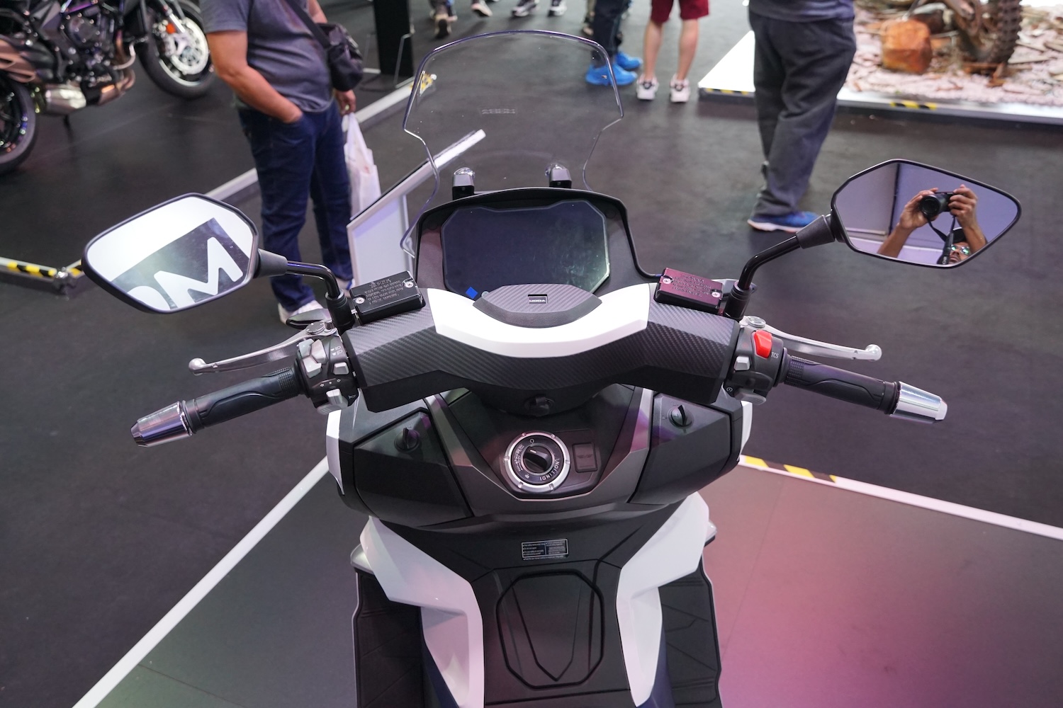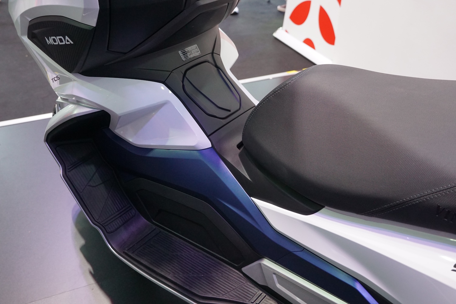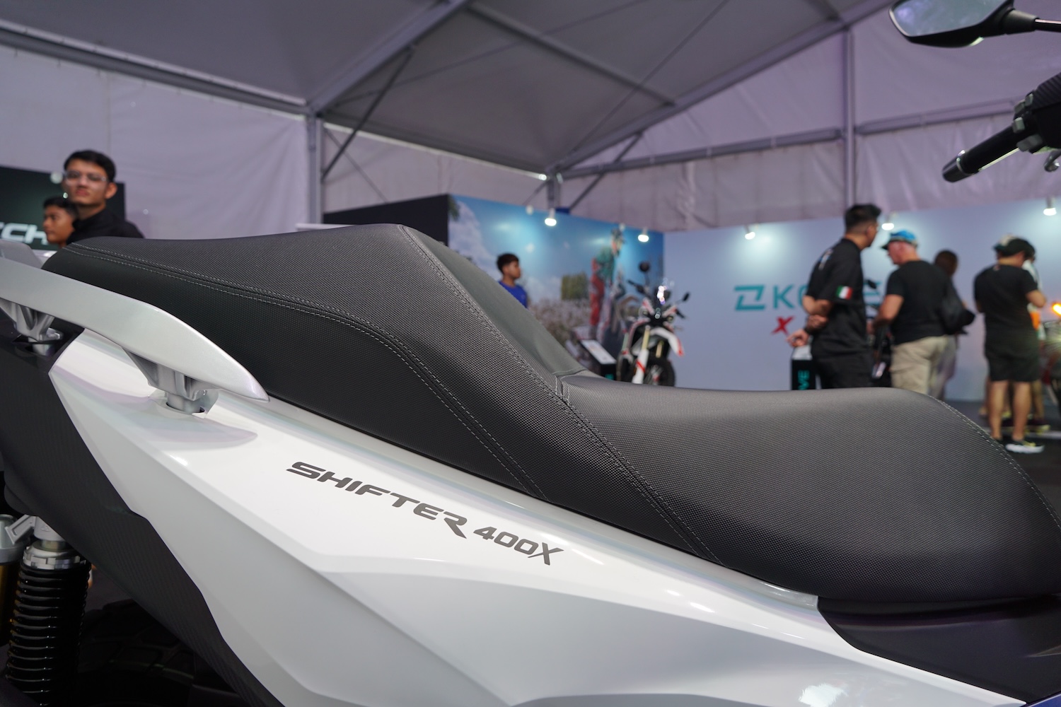 Pertama, ada penampilan skuter misteri berwarna putih biru dengan nama MODA Shifter 400X (2023). Kedua, ada lima model motosikal jenama Kove disusun di satu sudut bersebelahan motosikal MV Agusta.