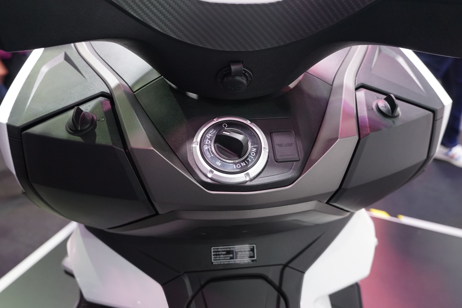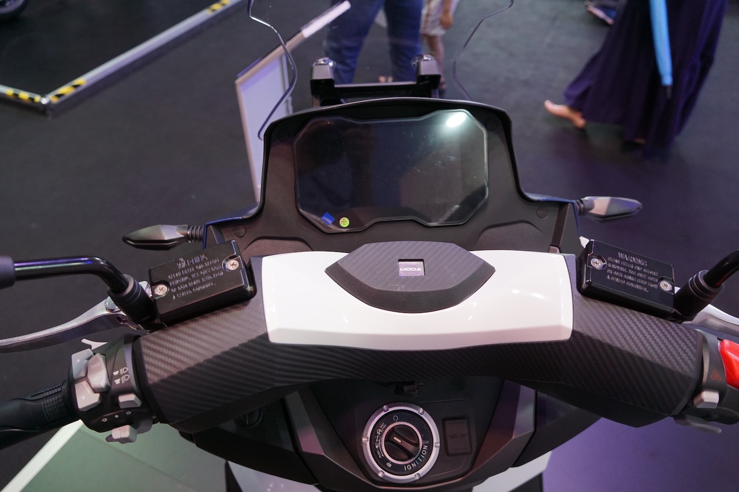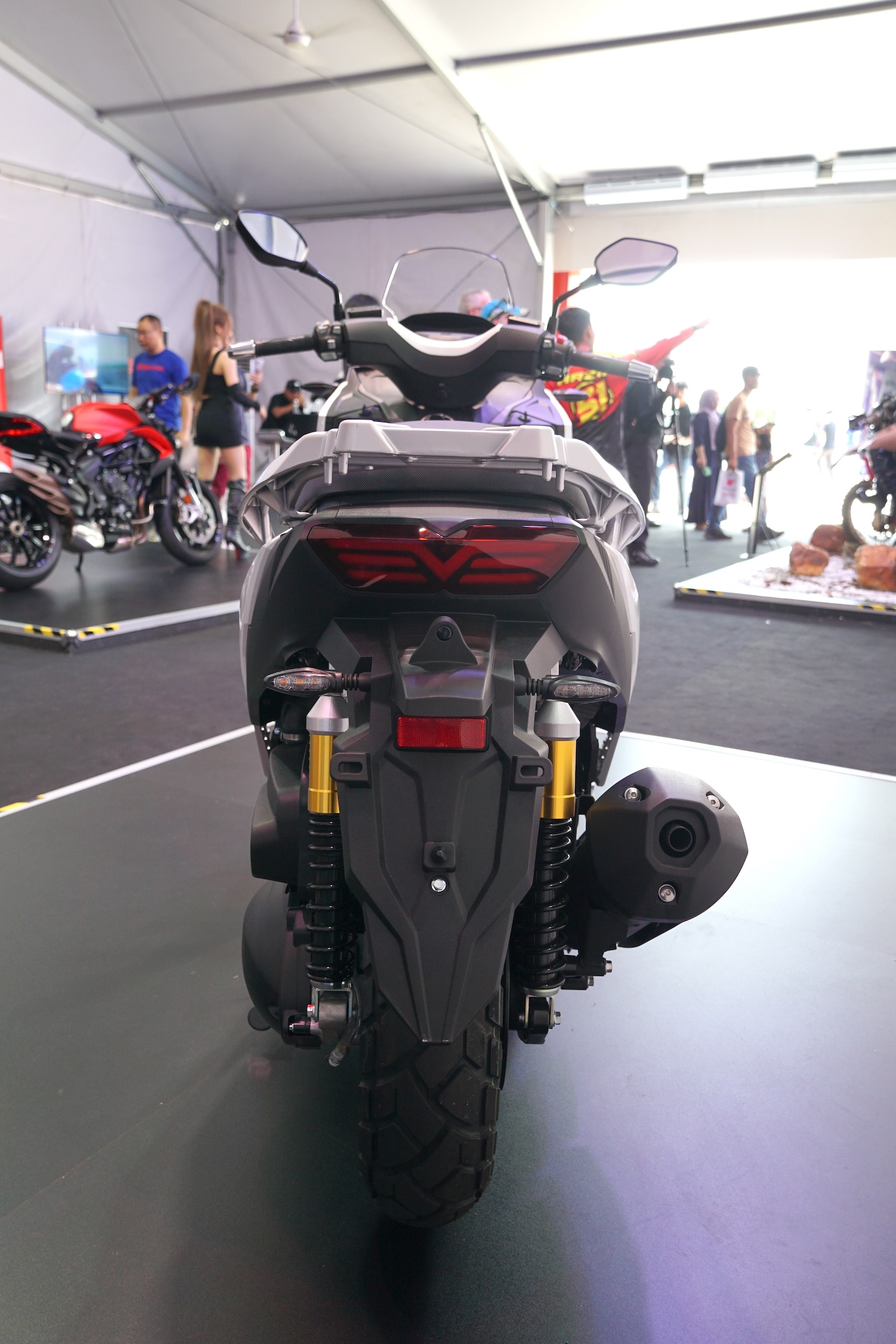 Pertama, ada penampilan skuter misteri berwarna putih biru dengan nama MODA Shifter 400X (2023). Kedua, ada lima model motosikal jenama Kove disusun di satu sudut bersebelahan motosikal MV Agusta.