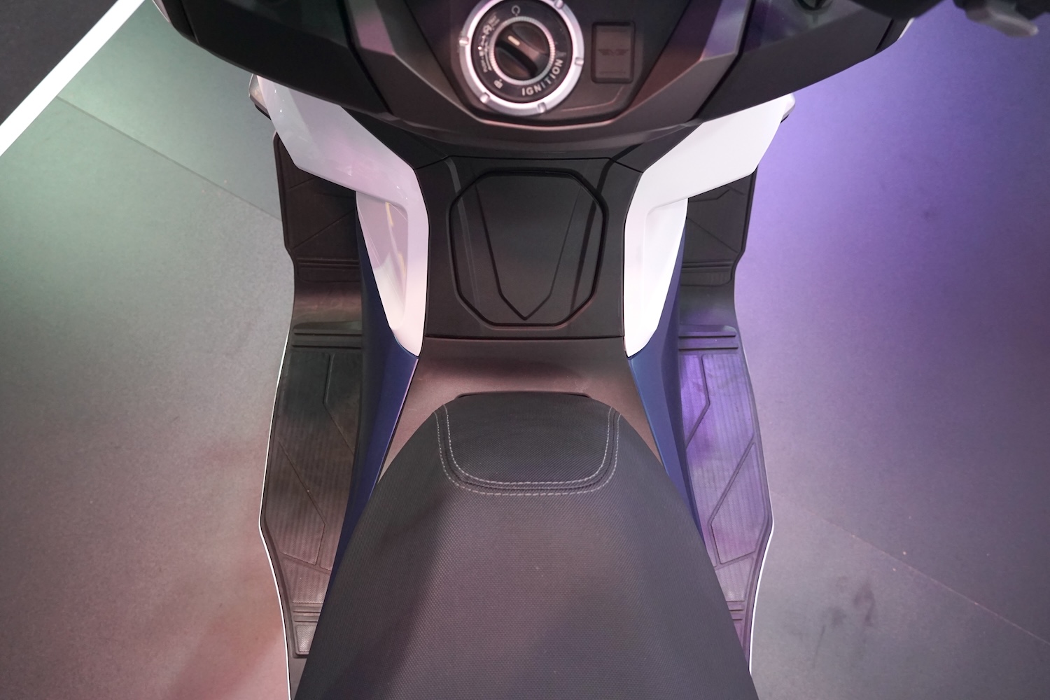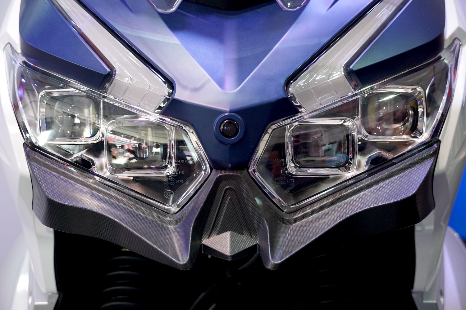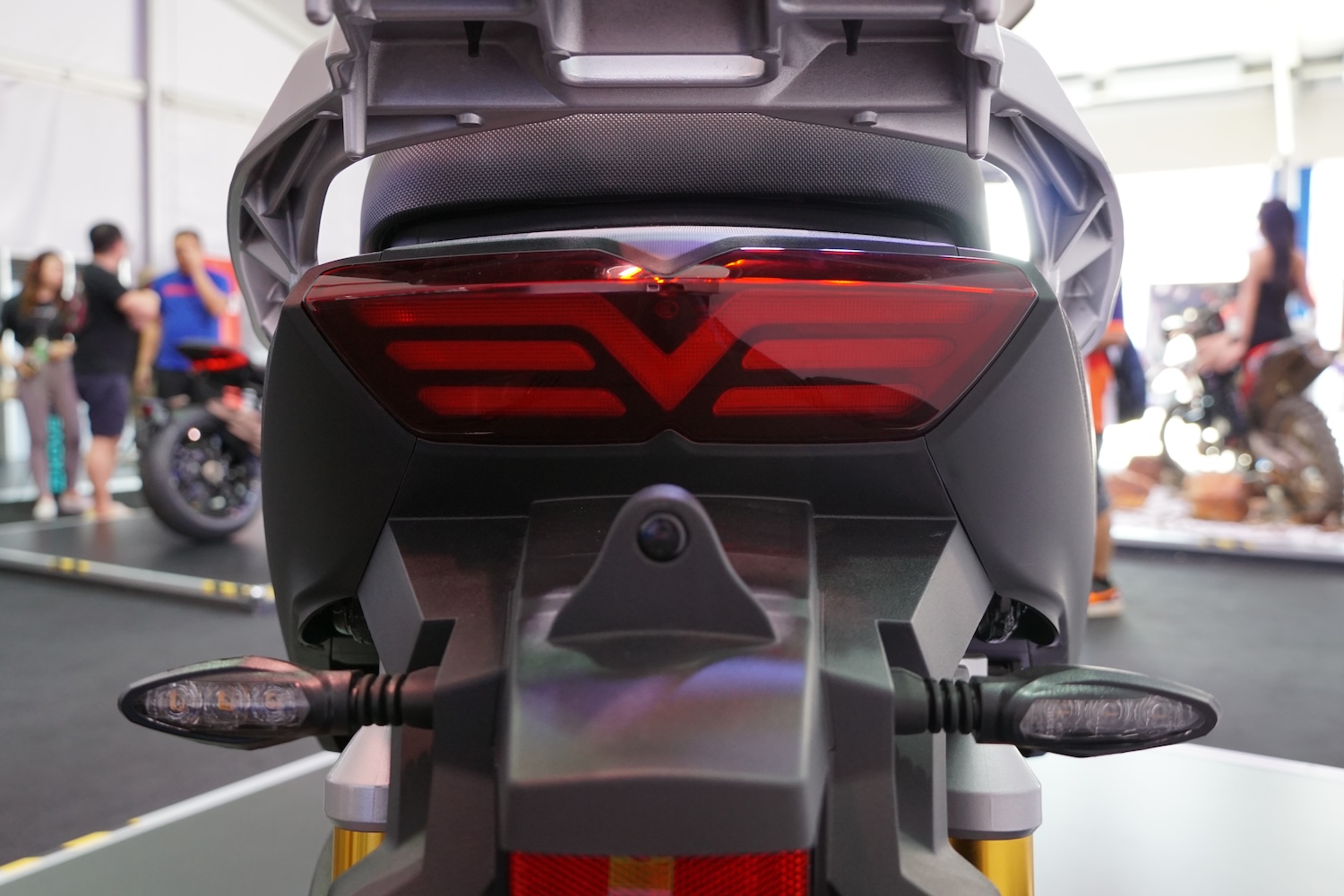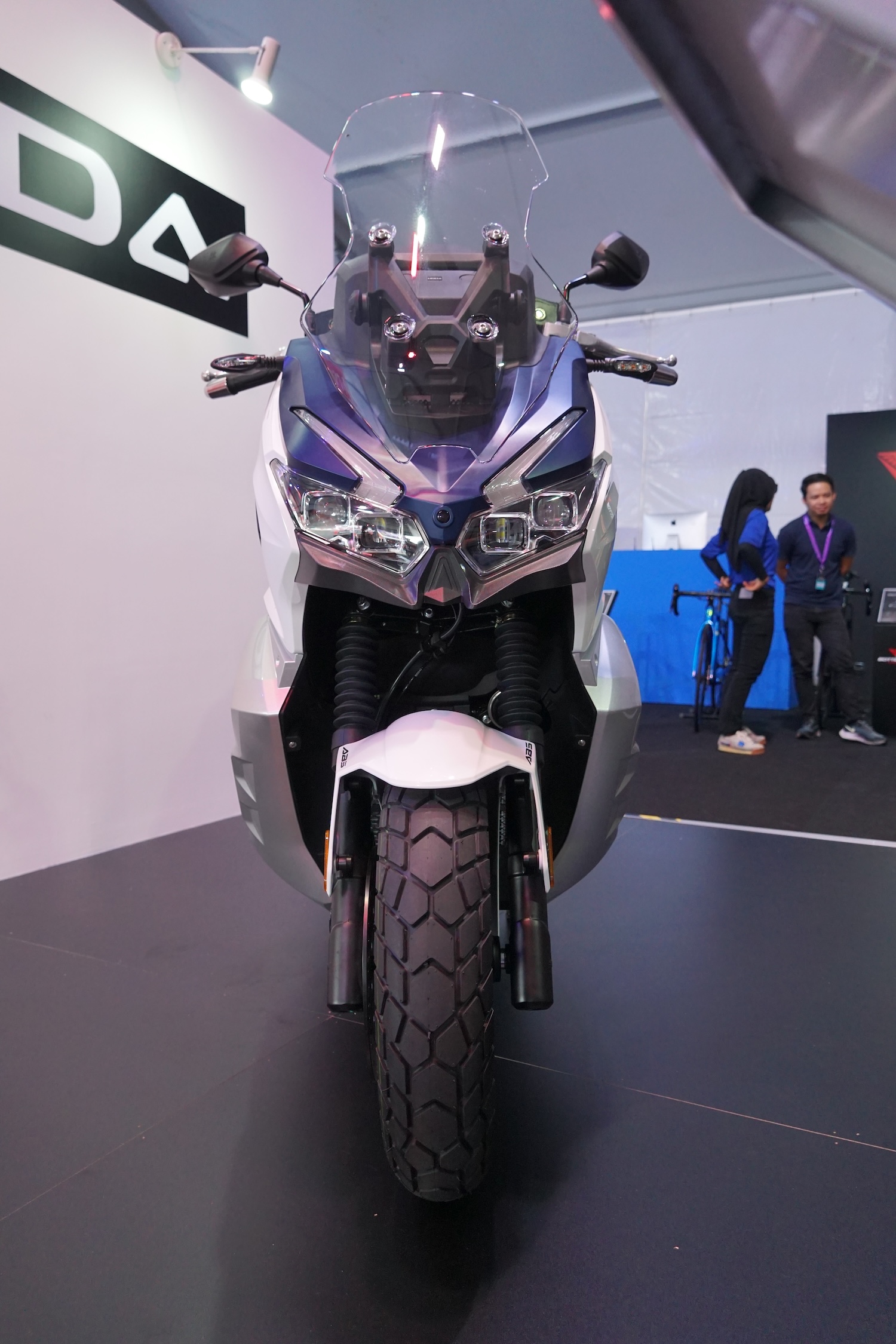 Pertama, ada penampilan skuter misteri berwarna putih biru dengan nama MODA Shifter 400X (2023). Kedua, ada lima model motosikal jenama Kove disusun di satu sudut bersebelahan motosikal MV Agusta.