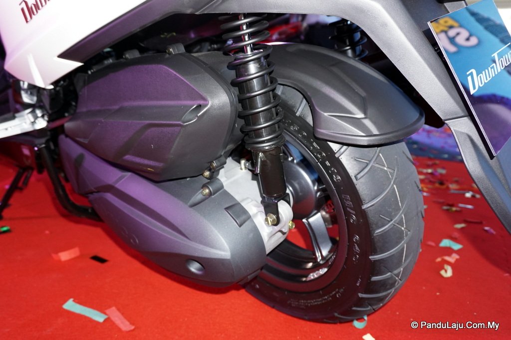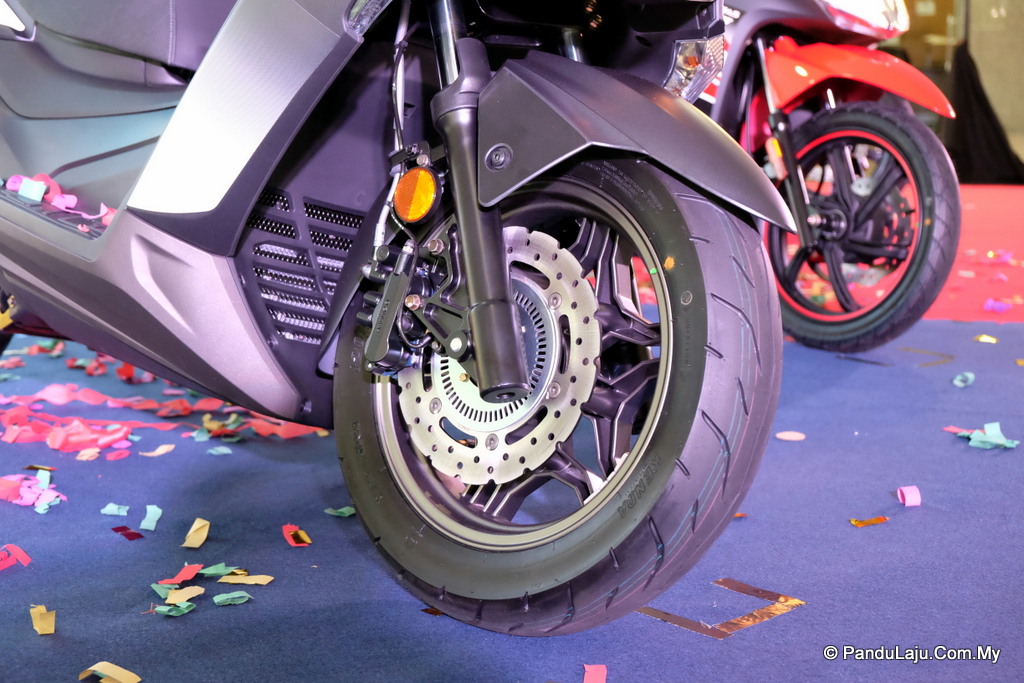 Ruangan roda hadapan dipadankan dengan rim 14-inci bersama pasangannya, tayar 120/80. Manakala roda belakang pula menggunakan rim 13-inci dengan tayar 150/70.
