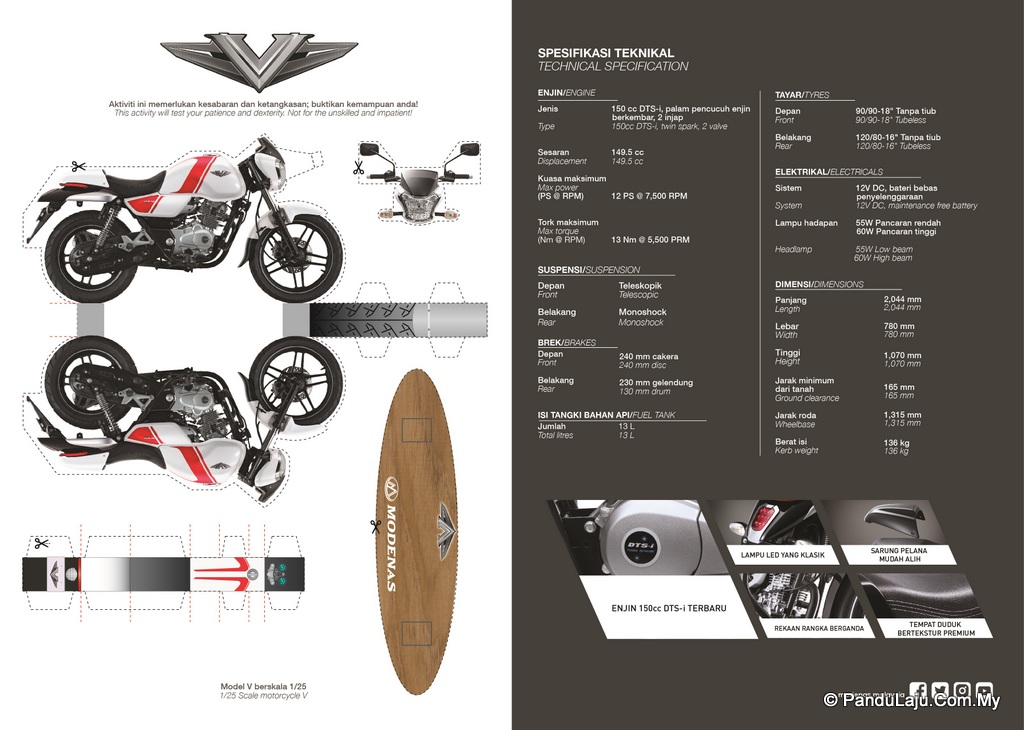 Berlainan pula dengan Modenas V15. Motosikal cafe racer itu dipadankan enjin bersesaran 150cc yang mampu menghasilkan kuasa sebanyak 12PS pada 7,500rpm bersama tork 13Nm (5,500rpm).