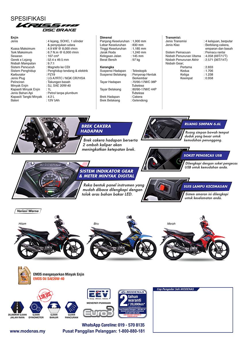 MODENAS hari ini melancarkan kapcai ikonik Kriss 110 Disc Brake baharu yang dilengkapkan brek cakera dwi-piston dan akan dijual di pasaran pada harga mampu milik, RM3,877 sahaja.