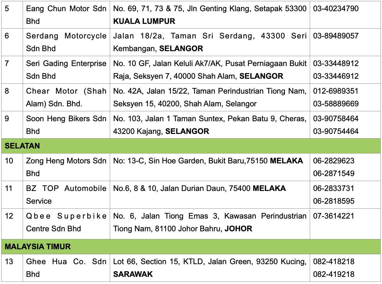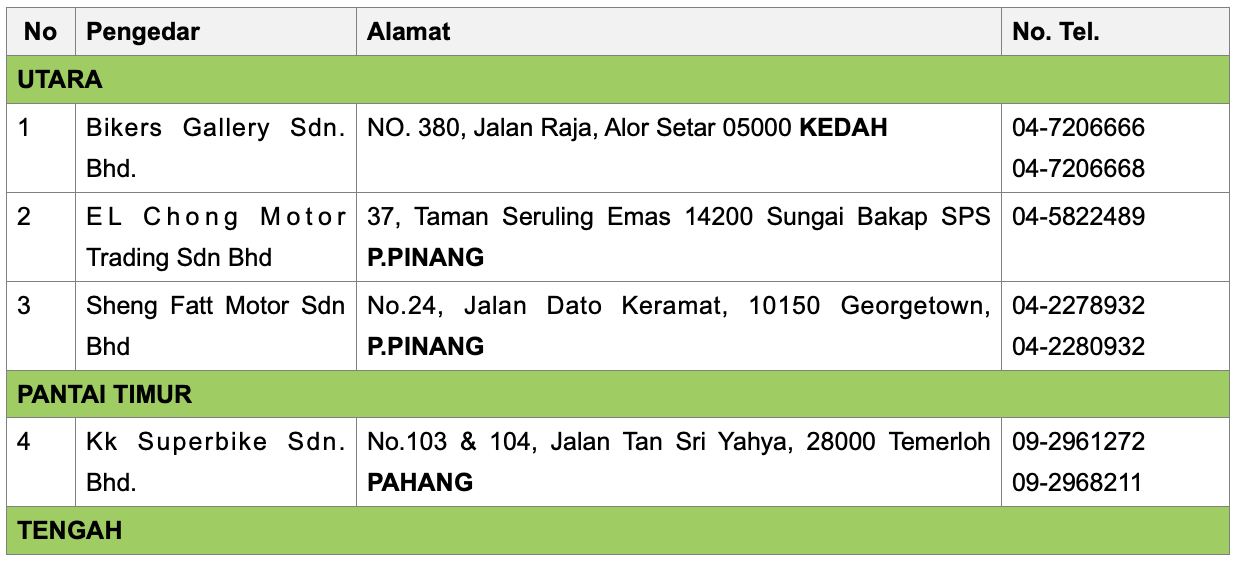 Seterusnya bagi semua jualan motosikal Kawasaki, alat ganti dan pertanyaan perkhidmatan berkaitan teknikal, boleh rujuk pengedar sah Kawasaki terpilih di bawah. Sebarang pertanyaan pemilik Kawasaki boleh menghubungi WhatsApp KAWASAKI Careline di talian +6019-570 8135.