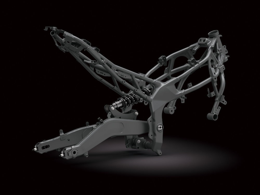 Sistem suspensi fork terbalik (USD) SFF-BP boleh laras prabeban di depan dan monoshock Horizontal Back-link boleh laras prabeban (belakang).