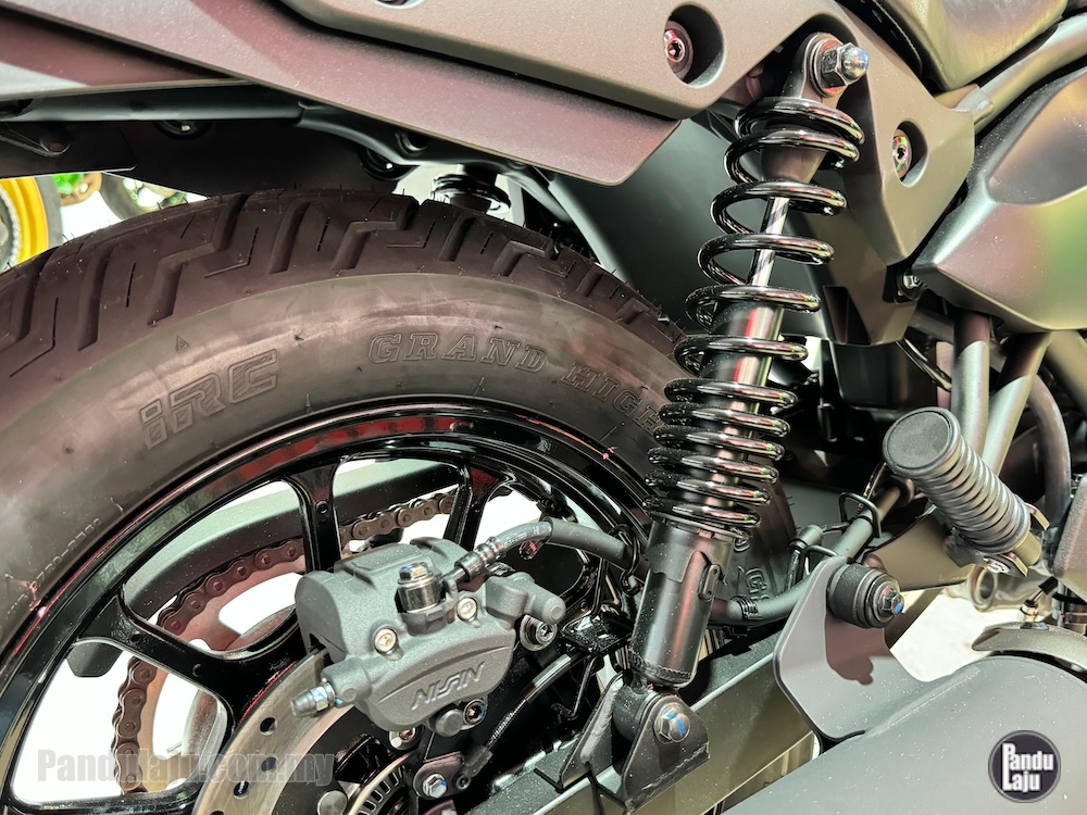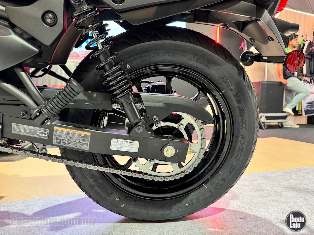 - Rim aloi 18 inci dengan tayar 130/70 (depan), rim aloi 16 berserta 150/80 (belakang).