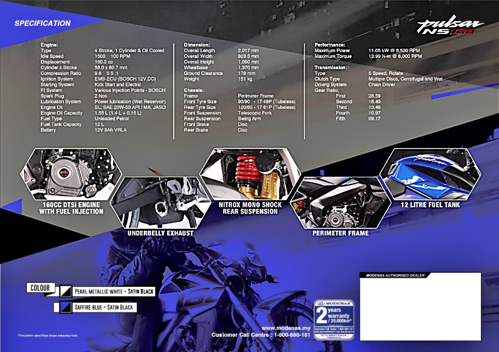 Sistem suspensi Pulsar NS160 dilengkapkan monoshock Nitrox yang sesuai untuk tunggangan jarak dekat dan sederhana sama ada dalam bandar atau pedalaman. Kapasiti tangki minyak 12 liter mampu memberikan jarak perjalanan sejauh 400km. Boleh tahan!