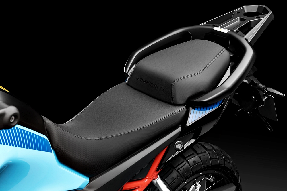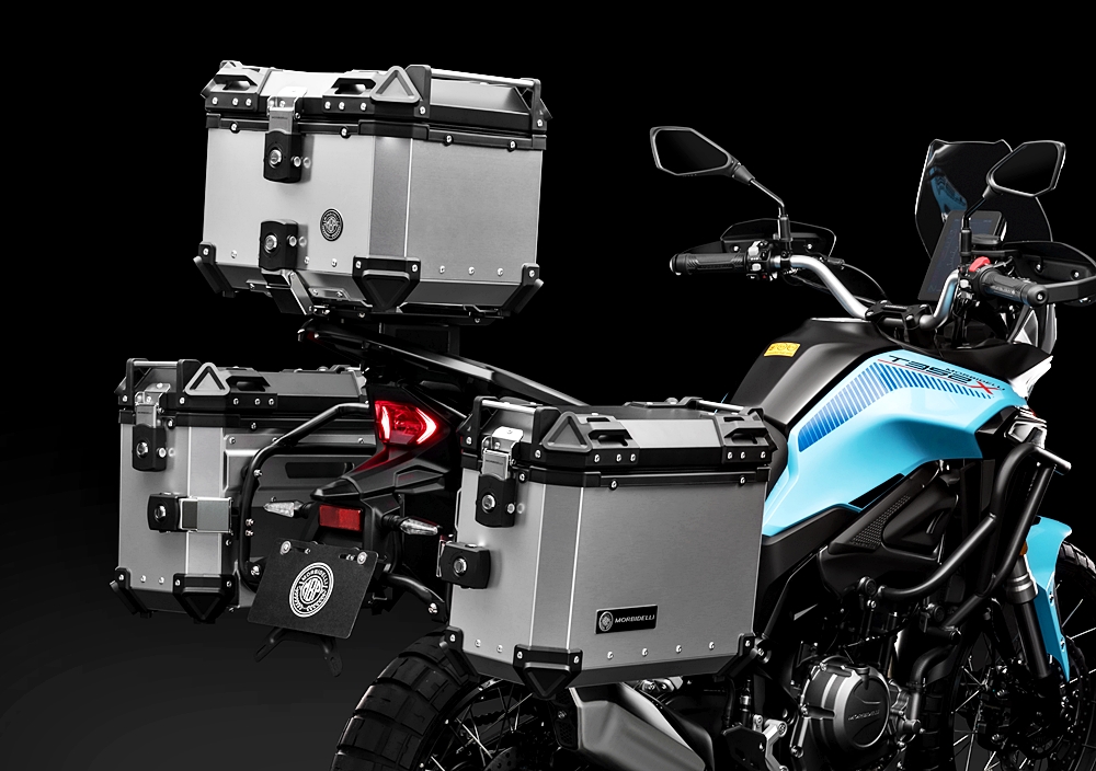 Penunggang boleh menggunakan sistem bagasi rasmi Morbidelli, sama ada kotak aluminium keras atau beg lembut kalis air, menjadikannya fleksibel untuk kegunaan harian atau pengembaraan jarak jauh.