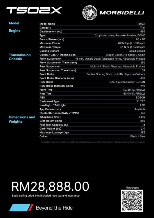 Morbidelli T502X ditawarkan pada harga RM28,888, tidak termasuk cukai jalan, insurans dan pendaftaran.