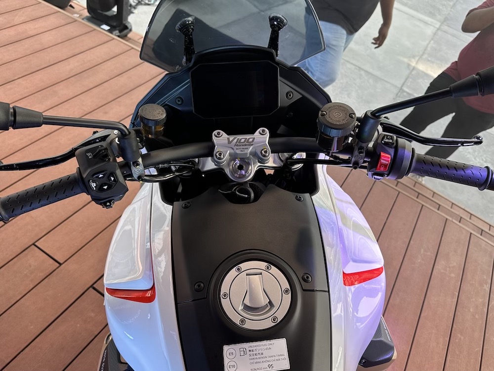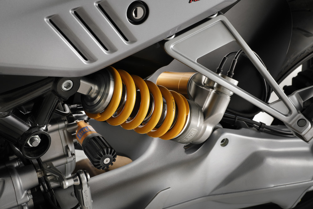 - Varian V100 Mandello S dipasangkan fork USD Öhlins Smart EC 2.0 semi-aktif 43mm boleh laras penuh dan monoshock Ohlins Smart EC 2.0 semi-aktif boleh laras penuh.